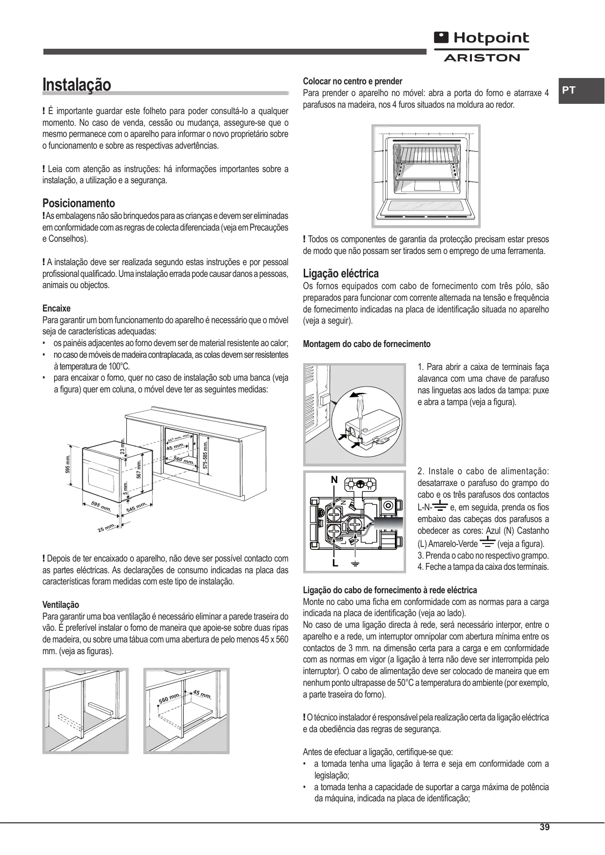 Airbag è il servizio esclusivo creato da Ariston che integra e prolunga nel tempo i contenuti della garanzia standard: con una modica cifra protegge il cliente da ogni imprevisto riguardante l’assistenza e la manutenzione dell’elettrodomestico. Per i 5 anni successivi alla data di acquisto il cliente che aderisce al programma Airbag avrà diritto gratuitamente a: Esta información se encuentra en la placa de características colocada en el aparato. La siguiente información es válida solo para España. Para otros países de habla hispana consulte a su vendedor. Ampliación de garantía Llame al 902.363.539 y le informaremos sobre el fantástico plan de ampliación de garantía hasta 5 años. Consiga una cobertura total adicional de • piezas y componentes • mano de obra de los técnicos • desplazamiento a su domicilio de los técnicos Y NO PAGUE AVERIAS NUNCA MAS Servicio de asistencia técnica (SAT) Llame al 902.133.133 y nuestros técnicos intervendrán con rapidez y eficacia, devolviendo el electrodoméstico a sus condiciones óptimas de funcionamiento. En el SAT encontrará recambios, accesorios y productos específicos para la limpieza y mantenimiento de su electrodoméstico a precios competitivos. Centrage et fixation Pour fixer l’appareil au meuble : ouvrir la porte du four et visser 4 vis à bois dans les 4 trous du cadre.