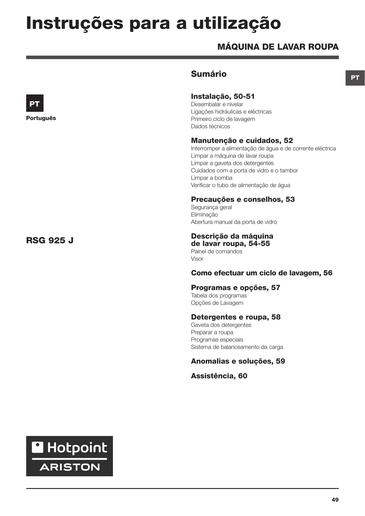 Instalação, 50-51 Desembalar e nivelar Ligações hidráulicas e eléctricas Primeiro ciclo de lavagem Dados técnicos Manutenção e cuidados, 52 Interromper a alimentação de água e de corrente eléctrica Limpar a máquina de lavar roupa Limpar a gaveta dos detergentes Cuidados com a porta de vidro e o tambor Limpar a bomba Verificar o tubo de alimentação de água Precauções e conselhos, 53 Segurança geral Eliminação Abertura manual da porta de vidro RSG 925 J Descrição da máquina de lavar roupa, 54-55 Painel de comandos Visor Como efectuar um ciclo de lavagem, 56 Programas e opções, 57 Tabela dos programas Opções de Lavagem Detergentes e roupa, 58 Gaveta dos detergentes Preparar a roupa Programas especiais Sistema de balanceamento da carga Anomalias e soluções, 59 Assistência, 60