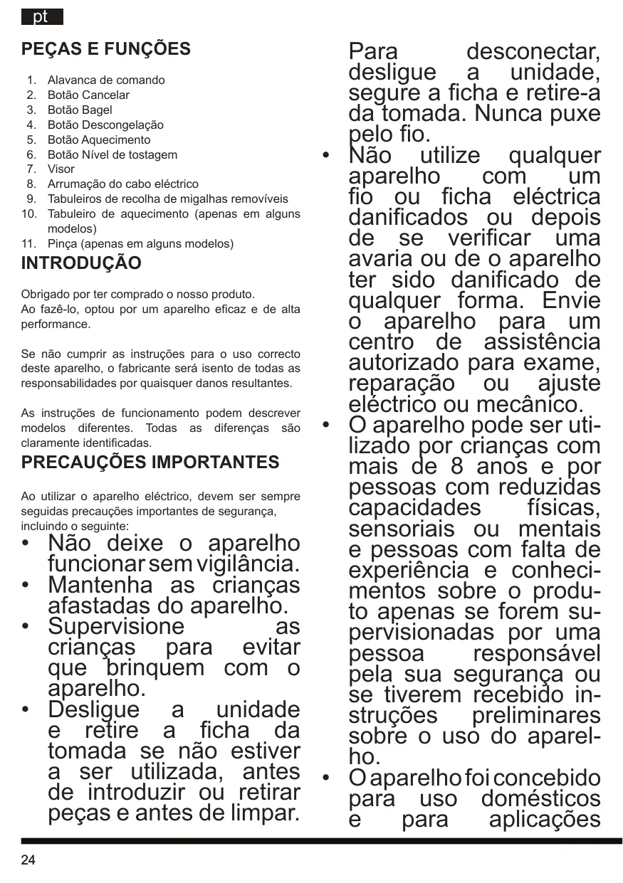Desligue aunities e retire a ficha da tomada se não estivera ser utilizes, antes de introduzir ou退回 peças e antes de limpar.