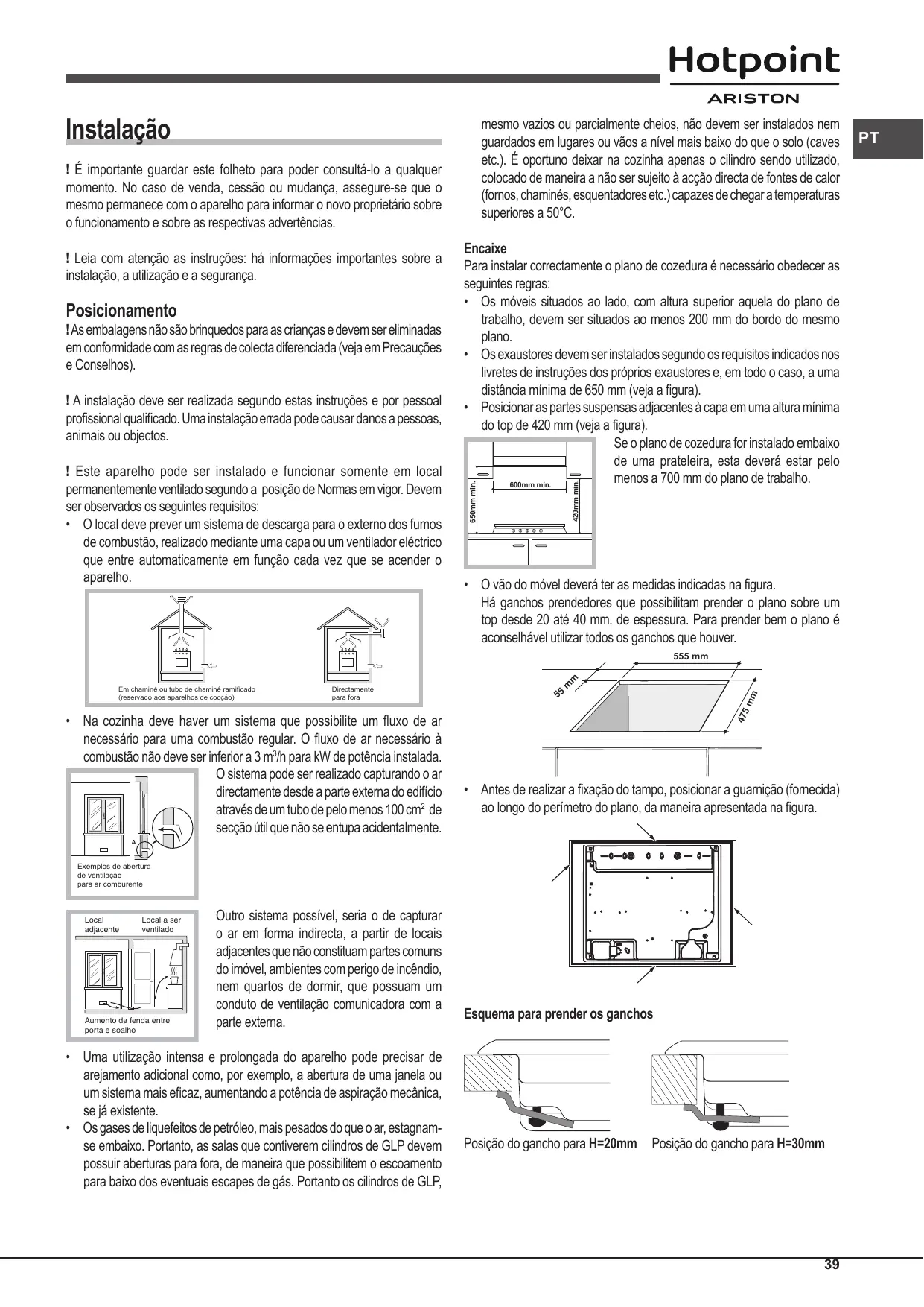 Posição do gancho para H=40mm Atrás ! Utilize os ganchos fornecidos dentro da “embalagem dos acessórios”. • Se o plano de cozedura não for instalado sobre um forno de encaixar, é necessário inserir um painel de madeira como isolamento. O mesmo deverá ser posicionado a uma distância mínima de 20 mm da parte inferior do plano. Ventilação Para garantir uma boa ventilação é necessário eliminar a parede traseira do vão. É preferível instalar o forno de maneira que apoie-se sobre duas ripas de madeira, ou sobre uma tábua com uma abertura de pelo menos 45 x 560 mm. (veja as figuras).