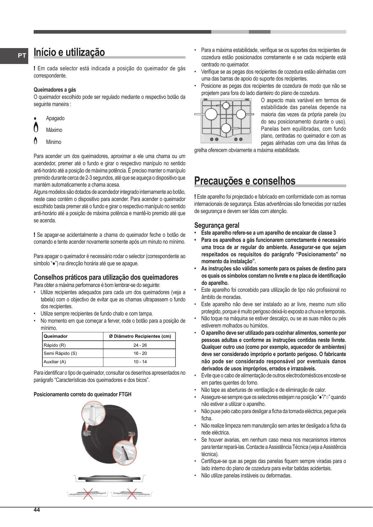 - Posicione as pegas dos recipientes de cozedura de modo que não se projetem para fora do lado dianteiro do plano de cozedura. O aspecto mais variável em termos de estabilidade das panelas depende na maioria das vezes da própria panela (ou do seu posicionamento durante o uso). Panelas bem equilibradas, com fundo plano, centradas no queimador e com as pegas alinhadas com uma das linhas da grelha oferecem obviamente a máxima estabilidade. Precauções e conselhos ! Este aparelho foi projectado e fabricado em conformidade com as normas internacionais de segurança. Estas advertências são fornecidas por razões de segurança e devem ser lidas com atenção. Segurança geral