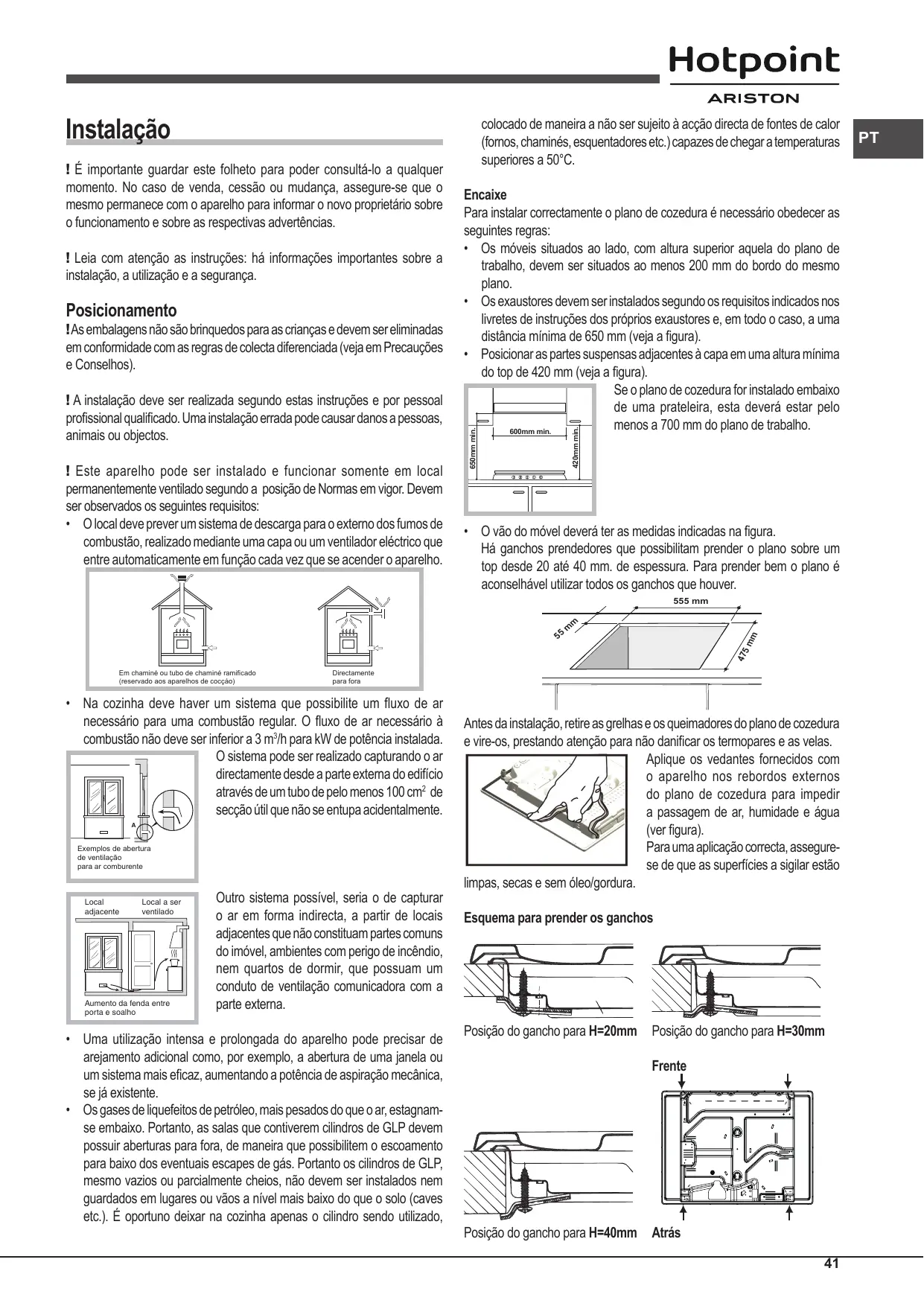 - O local deve prever um sistema de descarga para o externo dos fumos de combustão, realizado mediante uma capa ou um ventilador eléctrico que entre automaticamente em função cada vez que se acender o aparelho. 420mm min. ! Leia com atenção as instruções: há informações importantes sobre a instalação, a utilização e a segurança. Encaixe Para instalar correctamente o plano de cozedura é necessário obedecer as seguintes regras: