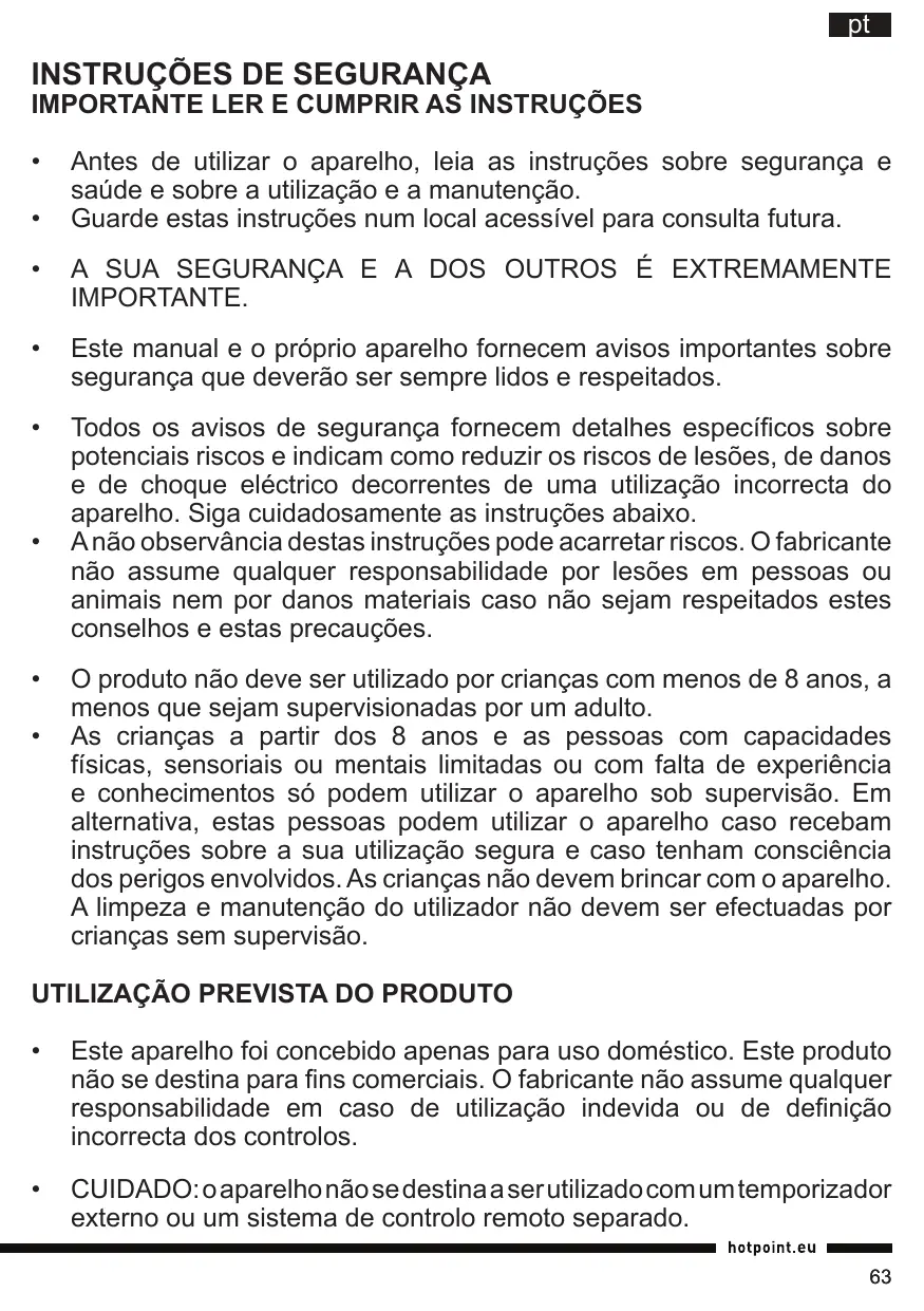 O produto não deve ser utilizado por crianças com menos de 8 anos, a menos que sejam supervisionadas por um adulto. As crianças a partir dos 8 anos e as pessoas com capacidades físicas, sensoriais ou mentais limitadas ou com falta de experiência e conhecimentos só podem utilizar o aparelho sob supervisão. Em alternativa, estas pessoas podem utilizar o aparelho caso recebam instruções sobre a sua utilização segura e caso tenham consciência dos perigos envolvidos. As crianças não devem brincar com o aparelho. A limpeza e manutenção do utilizador não devem ser efectuadas por crianças sem supervisão.