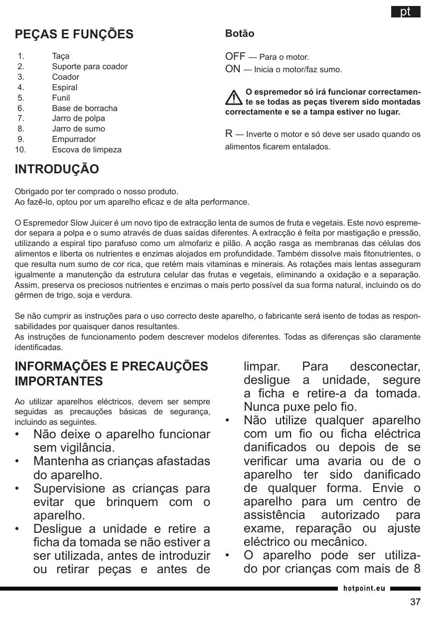 Se houver uma quebra de corrente, o aparelho permanece ligado e volta a iniciar quando a corrente for restabelecida. Desligue a unidade e retire a ficha da tomada se não estiver a ser utilizada, antes de introduzir ou retirar peças e antes de limpar. Para desconectar, desligue a unidade, segure a ficha e retire-a da tomada. Nunca puxe pelo fio. Evite o contacto com partes em movimento e mantenha os dedos afastados das aberturas de descarga ou do tubo de alimentação do funil. Para evitar lesões, as reparações como a substituição de um fio eléctrico danificado deve ser executadas apenas pelo nosso serviço de assistência. O uso de peças não recomendadas ou vendidas pelo fabricante do aparelho pode causar incêndios, choques eléctricos ou lesões. Não deixe o fio pendurado no rebordo da mesa ou bancada nem permita que toque em superfícies quentes. Não use o aparelho na presença de fumos explosivos e/ou inflamáveis. Não tente quebrar o mecanismo de interbloqueio da tampa. Para reduzir o risco de choque eléctrico, não tente remover a cobertura do fundo. Não existem peças que podem ser reparadas pelo utilizador no interior. As reparações devem ser feitas apenas por pessoal autorizado. Não accione o aparelho antes de colocar alimentos; pode causar um ruído estridente. Não tente extrair sumo de materiais duros, sementes grandes (sementes que não podem ser engolidas ou mastigadas), caroços, gelo ou alimentos congelados. Se os alimentos ficarem entalados no tubo de alimentação, utilize apenas o empurrador recomendado. Verifique sempre se o aparelho está em boas condições e se as partes removíveis estão bem fixas. Verifique regularmente se o cabo eléctrico e a ficha apresentam cortes ou danos. Assegure-se de que as suas mãos estão bem secas antes de usar o botão. Não utilize durante mais de 30 minutos.