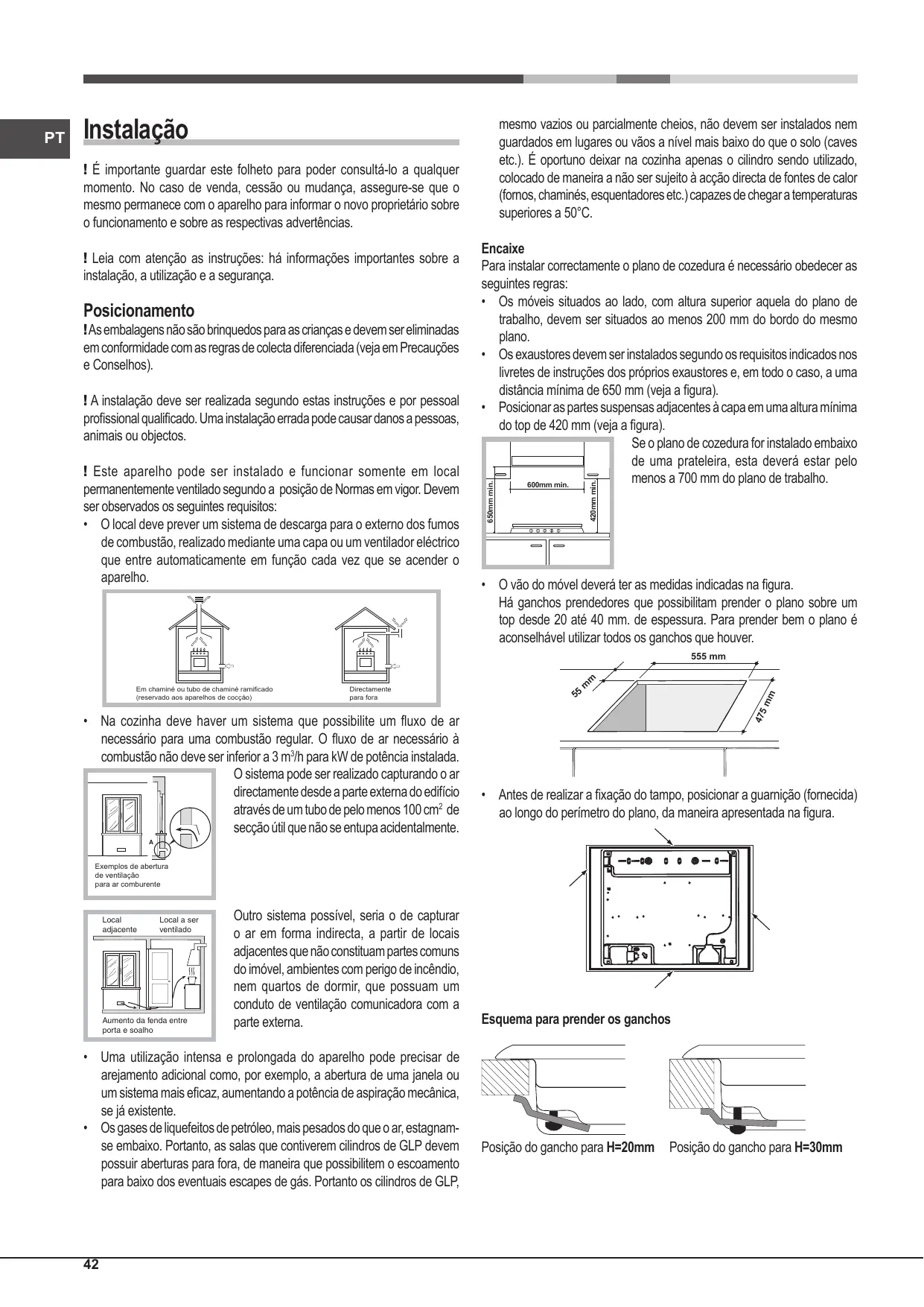 Posição do gancho para H=40mm Atrás ! Utilize os ganchos fornecidos dentro da “embalagem dos acessórios”. • Se o plano de cozedura não for instalado sobre um forno de encaixar, é necessário inserir um painel de madeira como isolamento. O mesmo deverá ser posicionado a uma distância mínima de 20 mm da parte inferior do plano. Ventilação Para garantir uma boa ventilação é necessário eliminar a parede traseira do vão. É preferível instalar o forno de maneira que apoie-se sobre duas ripas de madeira, ou sobre uma tábua com uma abertura de pelo menos 45 x 560 mm. (veja as figuras).