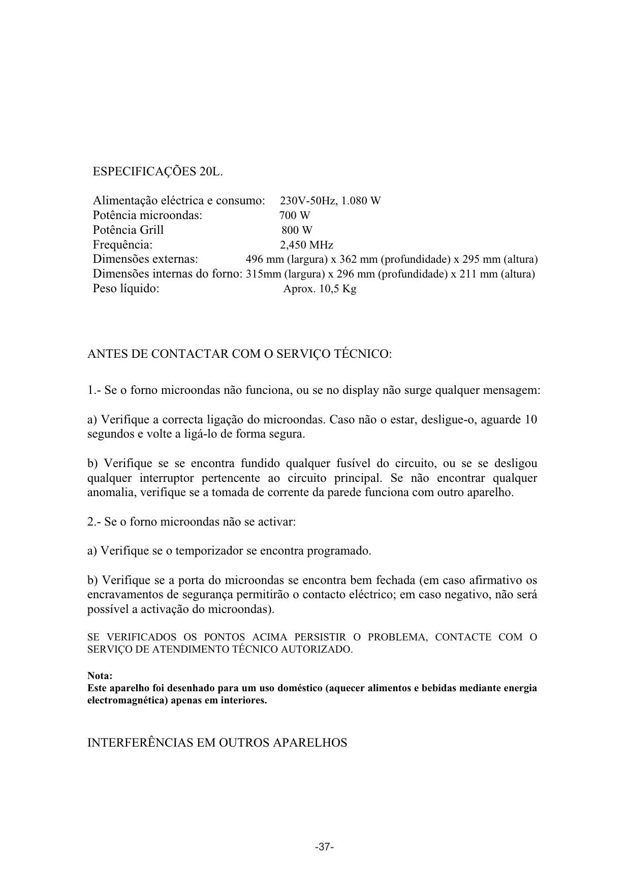 2.- Este forno quer uma alimentacao eletrica de 1.3 KVA. Aconselhamos consulutar o服务于 para instalar o forno.