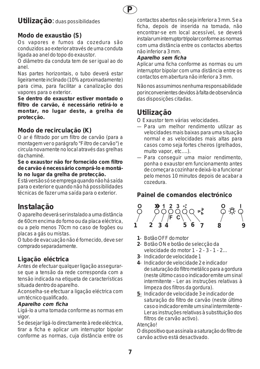 (2) Utilizaçäo: duas possibilidades Modo de exaustäo (S) Os vapores e fumos da cozedura säo conduzidos ao exterior através de uma conduta ligada ao anel do topo do exaustor. © diâmetro da conduta tem de ser igual ao do anel. Nas partes horizontais, o tubo deveré estar ligeiramente inclinado (10% aproximadamente) para cima, para facilitar a canalizaçäo dos vapores para o exterior. Se dentro do exaustor estiver montado o filtro de carväo, é necessärio retirä-lo e montar, no lugar deste, a grelha de protecçäo. Modo de recirculaçäo (K) © aré filtrado por um filtro de carväo (para a montagem vero parägrafo "Filtro de carväo")e circula novamente no local através das grelhas da chaminé. Se o exaustor näo for fornecido com filtro de carväo énecessärio comprä-lo e montä- lo no lugar da grelha de protecçäo. Esté versäo s6 se emprega quando näo hé saida para o exterior e quando näo hé possibilidades técnicas de fazer uma saida para o exterior. Instalaçäo © aparelho deveré serinstalado a uma distäncia de 60cm encima do forno ou da placa eléctrica, ou à pelo menos 70cm no caso de fogôes ou placas a gés ou mistas. © tubo de evacuaçäo näo é fornecido, deve ser comprado separadamente. Ligaçäo eléctrica Antes de efectuar qualquerligaçäo assegurar- se que a tensäo da rede corresponda com a tensäo indicada na etiqueta de caracteristicas situada dentro do aparelho. Aconselha-se efectuar a ligaçäo eléctrica com umtécnico qualificado. Aparelho com ficha Ligé-lo à uma tomada conforme as normas em vigor. Se desejarligä-lo directamente à rede eléctrica, tirar a ficha e aplicar um interruptor bipolar conforme as normas, cuja distäncia entre os contactos abertos nâo seja inferiora 3mm.Sea ficha, depois de inserida na tomada, näo encontrar-se em local acessivel, se deverä instalaruminterruptortripolar conforme as normas com uma distäncia entre os contactos abertos näo inferior a 3 mm. Aparelho sem ficha Aplicar uma ficha conforme as normas ou um interruptor bipolar com uma distncia entre os contactos em abertura näo inferiora 3mm. Näonos assumimos nenhuma responsabilidade porinconvenientes devidos à falta de observäncia das disposiçôes citadas. Utilizaçäo O Exaustor tem vérias velocidades. — Para um melhor rendimento utilizar as velocidades mais baixas para uma situaçäo normal e as velocidades mais altas para casos como seja fortes cheiros (grelhados, muito vapor, etc…..). — Para conseguir uma maior rendimento, ponha o exaustor em funcionamento antes de começara cozinhar e deixä-lo a funcionar pelo menos 10 minutos depois de acabar a cozedura. Painel de comandos electrénico re] D2123>*# [e] ! MAILS ES F C