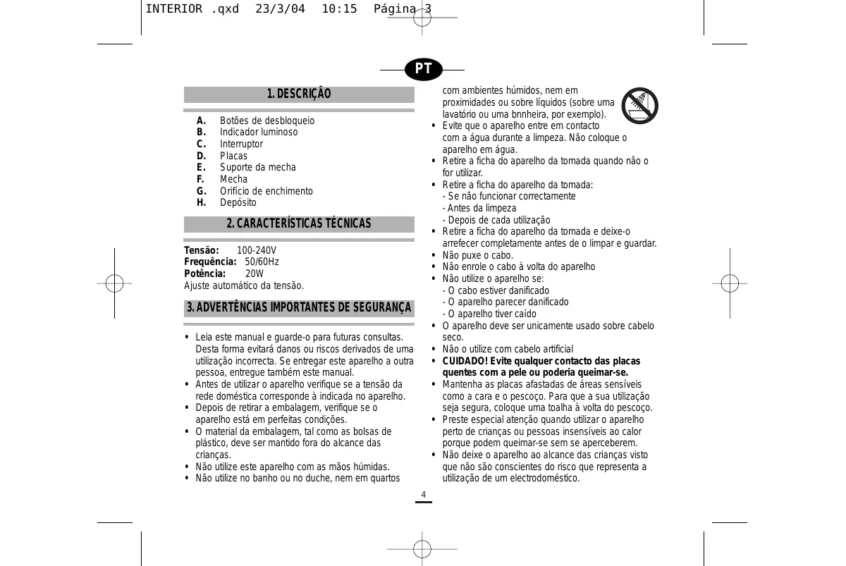 com ambientes húmidos, nem em proximidades ou sobre líquidos (sobre uma lavatório ou uma bnnheira, por exemplo). Evite que o aparelho entre em contacto com a água durante a limpeza. Não coloque o aparelho em água. Retire a ficha do aparelho da tomada quando não o for utilizar. Retire a ficha do aparelho da tomada: - Se não funcionar correctamente - Antes da limpeza - Depois de cada utilização Retire a ficha do aparelho da tomada e deixe-o arrefecer completamente antes de o limpar e guardar. Não puxe o cabo. Não enrole o cabo à volta do aparelho Não utilize o aparelho se: - O cabo estiver danificado - O aparelho parecer danificado - O aparelho tiver caído O aparelho deve ser unicamente usado sobre cabelo seco. Não o utilize com cabelo artificial CUIDADO! Evite qualquer contacto das placas quentes com a pele ou poderia queimar-se. Mantenha as placas afastadas de áreas sensíveis como a cara e o pescoço. Para que a sua utilização seja segura, coloque uma toalha à volta do pescoço. Preste especial atenção quando utilizar o aparelho perto de crianças ou pessoas insensíveis ao calor porque podem queimar-se sem se aperceberem. Não deixe o aparelho ao alcance das crianças visto que não são conscientes do risco que representa a utilização de um electrodoméstico. INTERIOR .qxd 23/3/04 10:15 Página 4
