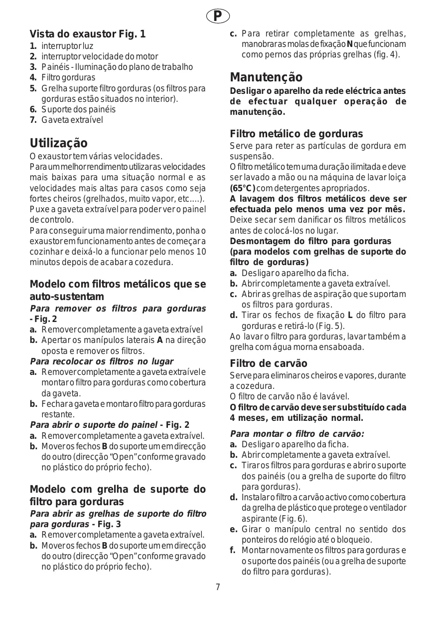 Manutenção Desligar o aparelho da rede eléctrica antes de efectuar qualquer operação de manutenção. Filtro metálico de gorduras Utilização Serve para reter as partículas de gordura em suspensão. O filtro metálico tem uma duração ilimitada e deve ser lavado a mão ou na máquina de lavar loiça (65°C) com detergentes apropriados. A lavagem dos filtros metálicos deve ser efectuada pelo menos uma vez por mês. Deixe secar sem danificar os filtros metálicos antes de colocá-los no lugar. Desmontagem do filtro para gorduras (para modelos com grelhas de suporte do filtro de gorduras) a. Desligar o aparelho da ficha. b. Abrir completamente a gaveta extraível. c. Abrir as grelhas de aspiração que suportam os filtros para gorduras. d. Tirar os fechos de fixação L do filtro para gorduras e retirá-lo (Fig. 5). Ao lavar o filtro para gorduras, lavar também a grelha com água morna ensaboada. O exaustor tem várias velocidades. Para um melhor rendimento utilizar as velocidades mais baixas para uma situação normal e as velocidades mais altas para casos como seja fortes cheiros (grelhados, muito vapor, etc....). Puxe a gaveta extraível para poder ver o painel de controlo. Para conseguir uma maior rendimento, ponha o exaustor em funcionamento antes de começar a cozinhar e deixá-lo a funcionar pelo menos 10 minutos depois de acabar a cozedura. Modelo com filtros metálicos que se auto-sustentam Para remover os filtros para gorduras - Fig. 2 a. Remover completamente a gaveta extraível b. Apertar os manípulos laterais A na direção oposta e remover os filtros. Para recolocar os filtros no lugar a. Remover completamente a gaveta extraível e montar o filtro para gorduras como cobertura da gaveta. b. Fechar a gaveta e montar o filtro para gorduras restante. Para abrir o suporte do painel - Fig. 2 a. Remover completamente a gaveta extraível. b. Mover os fechos B do suporte um em direcção do outro (direcção “Open” conforme gravado no plástico do próprio fecho). Filtro de carvão Serve para eliminar os cheiros e vapores, durante a cozedura. O filtro de carvão não é lavável. O filtro de carvão deve ser substituído cada 4 meses, em utilização normal. Para montar o filtro de carvão: a. Desligar o aparelho da ficha. b. Abrir completamente a gaveta extraível. c. Tirar os filtros para gorduras e abrir o suporte dos painéis (ou a grelha de suporte do filtro para gorduras). d. Instalar o filtro a carvão activo como cobertura da grelha de plástico que protege o ventilador aspirante (Fig. 6). e. Girar o manípulo central no sentido dos ponteiros do relógio até o bloqueio. f. Montar novamente os filtros para gorduras e o suporte dos painéis (ou a grelha de suporte do filtro para gorduras). Modelo com grelha de suporte do filtro para gorduras Para abrir as grelhas de suporte do filtro para gorduras - Fig. 3 a. Remover completamente a gaveta extraível. b. Mover os fechos B do suporte um em direcção do outro (direcção “Open” conforme gravado no plástico do próprio fecho).