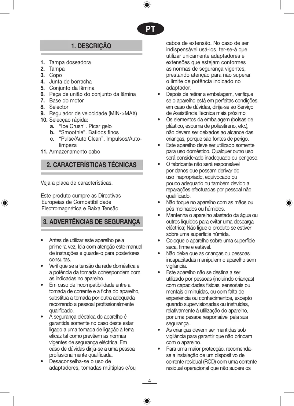 30 mA. Aconselhe-se com o técnico de instalação. Não abandonar o aparelho aceso porque pode ser fonte de perigo. Ao desligar a cavilha nunca puxe do cabo. Desligue o aparelho antes de efectuar qualquer operação de limpeza ou manutenção. Em caso de avaria ou mau funcionamento do aparelho e sempre que não o utilizar, desligue-o e não o repare. No caso de necessitar de reparação dirigir-se unicamente a um Serviço de Assistência Técnica autorizado pelo fabricante e solicitar o uso de peças de substituição originais. Se o cabo deste aparelho estiver danificado, dirija-se a um Centro de Assistência técnico autorizado para que o substituam. Não deixe o aparelho exposto aos agentes atmosféricos (chuva, sol, gelo etc.). Não utilize ou coloque nenhuma parte deste aparelho sobre ou próximo de superfícies quentes (placas de cozinha de gás ou eléctrica, fornos). Não utilize detergentes ou baetas abrasivas para limpar a unidade. Não toque as superfícies quentes. Utilize as pegas ou flexores. Evite que o cabo toque nas partes quentes do aparelho. A lâmina está muito afiada, utilize-a com cuidado para evitar cortes Não encha o liquidificador para além do nível máximo. Não retire o copo da base do motor quando o aparelho ainda estiver a funcionar. Utilize sempre o liquidificador com a tampa do copo devidamente colocada. Não coloque as mãos ou qualquer outro objecto no copo enquanto estiver a funcionar. Se for necessário desligue o aparelho e utilize uma espátula para retirar os alimentos que ficaram colados nas paredes do copo. Não mergulhe a base do motor em água ou em qualquer outro líquido. Não toque nas peças giratórias enquanto estiverem a funcionar, espere sempre que parem.