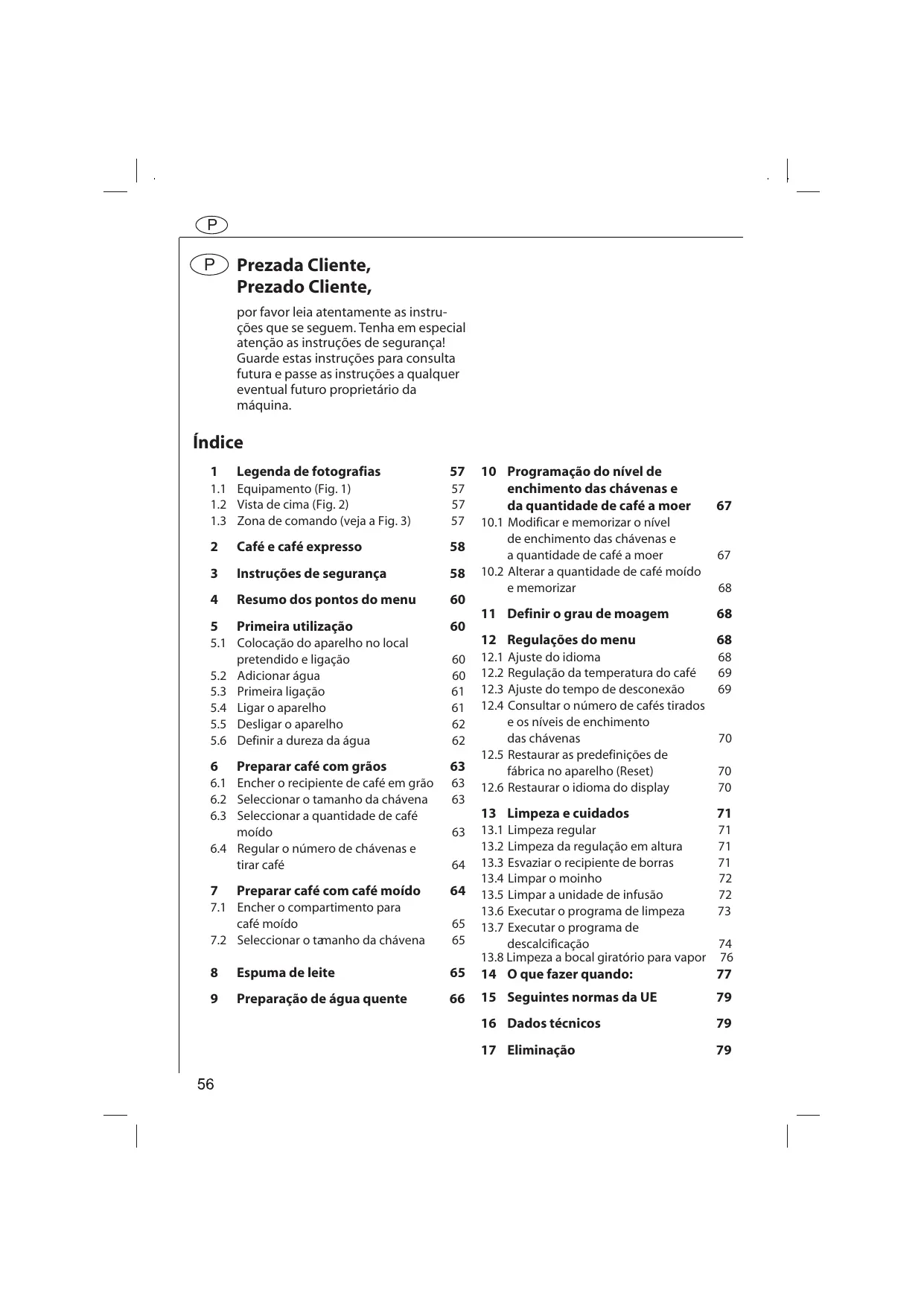 Prezada Cliente, Prezado Cliente, por favor leia atentamente as instruções que se seguem. Tenha em especial atenção as instruções de segurança! Guarde estas instruções para consulta futura e passe as instruções a qualquer eventual futuro proprietário da máquina. Índice