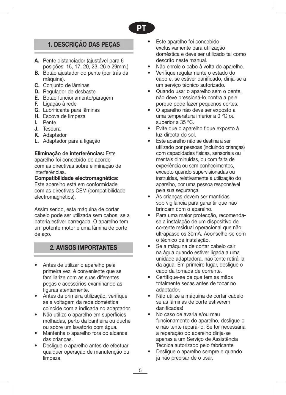 • Vérifiez périodiquement l’état du cordon. S’il est endommagé, adressezvous à un Service Technique agréé. Si vous utilisez la tondeuse sans le peigne, ne la frottez pas sur la peau, pour éviter de vous couper. Ne pas exposer l’appareil à une température inférieure à 0º C, ni supérieure à 35º C. Veillez à le garder toujours à l’abri des rayons directs du soleil. Cet appareil n’est pas destiné à être utilisé par des personnes (enfants y compris) souffrant d’un handicap physique, sensoriel ou mental, ni celles manquant d’expérience ou ignorant son fonctionnement, sauf si des instructions appropriées leur ont été données et sous la surveillance d’une personne responsable de leur sécurité. Ne laissez pas jouer les enfants avec l’appareil. Pour une plus grande protection, il est recommandé d’installer un disjoncteur différentiel à courant résiduel à haute sensibilité (RCD) de 30mA. Consultez votre installateur. Si la tondeuse en marche venait à se mouiller, ne tentez pas de la sécher. Débranchez aussitôt l’appareil de la prise de courant. Ne jamais toucher l’adaptateur avec les mains mouillées. Ne jamais utiliser la tondeuse si les lames de coupe sont endommagées. En cas de panne ou de défaillance de fonctionnement débranchez l’appareil et n’essayez pas de le réparer vousmême. Adressez-vous toujours, pour le réparer, à un Service d’Assistance Technique agréé par le fabriquant. Débranchez l’appareil lorsque vous ne l’utilisez pas. L’adaptateur de la tondeuse à cheveux sert à recharger la batterie de l’appareil. Vous pouvez vous coupez les cheveux
