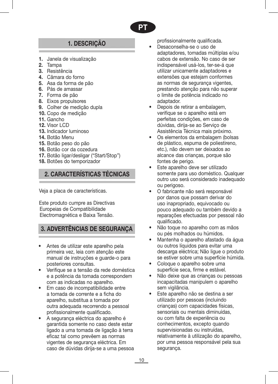 As crianças devem ser mantidas sob vigiläncia para garantir que näo brincam com o aparelho. Para uma maior protecçäo, recomenda- se a instalaçäo de um dispositivo de corrente residual (RCD) com uma corrente residual operacional que näo supere os 30 mA. Aconselhe-se com o técnico de instalaçäo. Näo abandonar o aparelho aceso porque pode ser fonte de perigo. Ao desligar a cavilha nunca puxe do cabo. Desligue o aparelho antes de efectuar qualquer operaçäo de limpeza ou manutençäo. Em caso de avaria ou mau funcionamento do aparelho e sempre que näo o utilizar, desligue-o e näo o repare. No caso de necessitar de reparaçäo dirigir-se unicamente a um Serviço de Assistência Técnica autorizado pelo fabricante e solicitar o uso de peças de substituiçäo originais. Se o cabo deste aparelho estiver danificado, dirija-se a um Centro de Assistência técnico autorizado para que o substituam. Näo deixe o aparelho exposto aos agentes atmosféricos (chuva, sol, gelo etc.). Näo utilize ou coloque nenhuma parte deste aparelho sobre ou préximo de superficies quentes (placas de cozinha de gâs ou eléctrica, fornos). Näo utilize detergentes ou baetas abrasivas para limpar a unidade. Näo toque as superficies quentes. Utilize as pegas ou flexores. Evite que o cabo toque nas partes quentes do aparelho. Proteja-se de queimaduras com luvas apropriadas. Deixar o forno arrefecer antes de proceder à sua limpeza. Näo introduzir o aparelho na ägua nem em nenhum outro liquido. Para acrescentar ingredientes retire sempre a forma de päâo da câmara do forno. Näo coloque a mäquina de fazer päo em funcionamento quando estiver vazia, uma vez que poderia danificä-la seriamente. + Näo utilize a câmara do forno para guardar seja o que for. + Näo tape as saidas de vapor e assegure-se de que a ventilaçäo à volta da mäquina de fazer pâo é suficiente enquanto estä em funcionamento. Coloque o aparelho pelo menos a 5 centimetros afastado da parede.