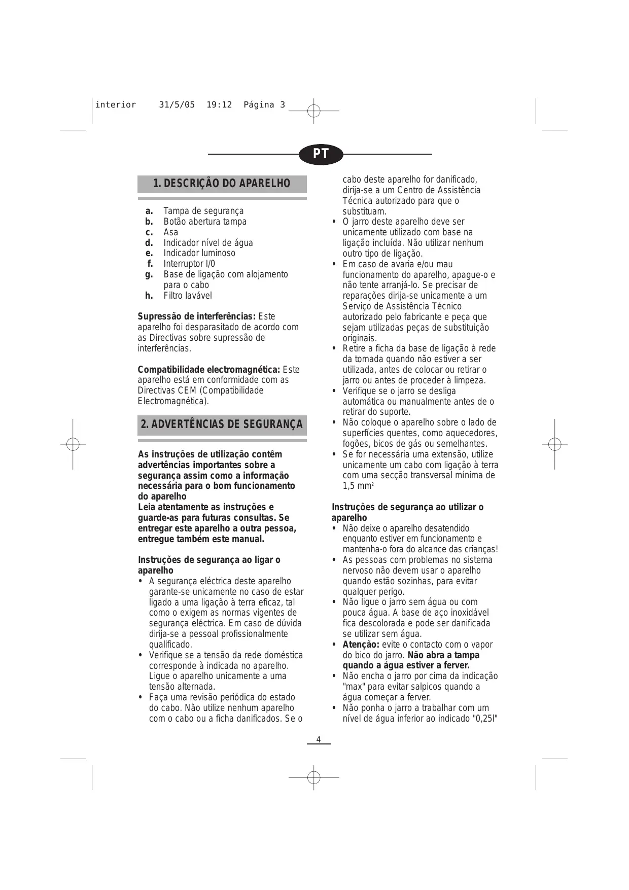 - Atenção: Quando o aparelho estiver em funcionamento, o jarro alcança temperaturas muito elevadas e existe risco de queimaduras. Utilize unicamente a asa para verter a água. Instruções de segurança para a limpeza e o manutenção