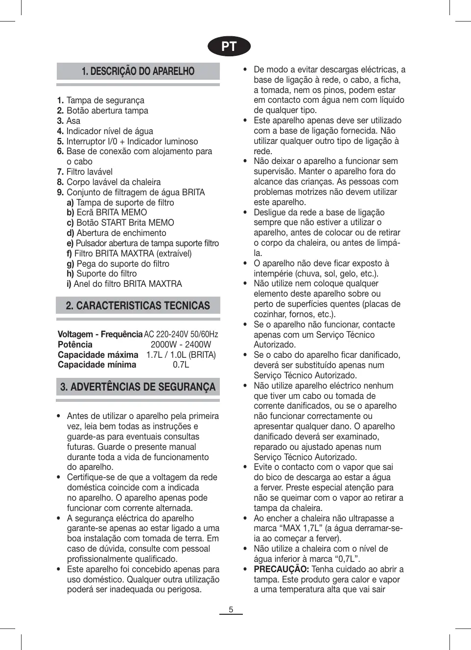 Voltagem - Frequência AC 220-240V 50/60Hz Potência 2000W - 2400W Capacidade máxima 1.7L / 1.0L (BRITA) Capacidade mínima 0.7L