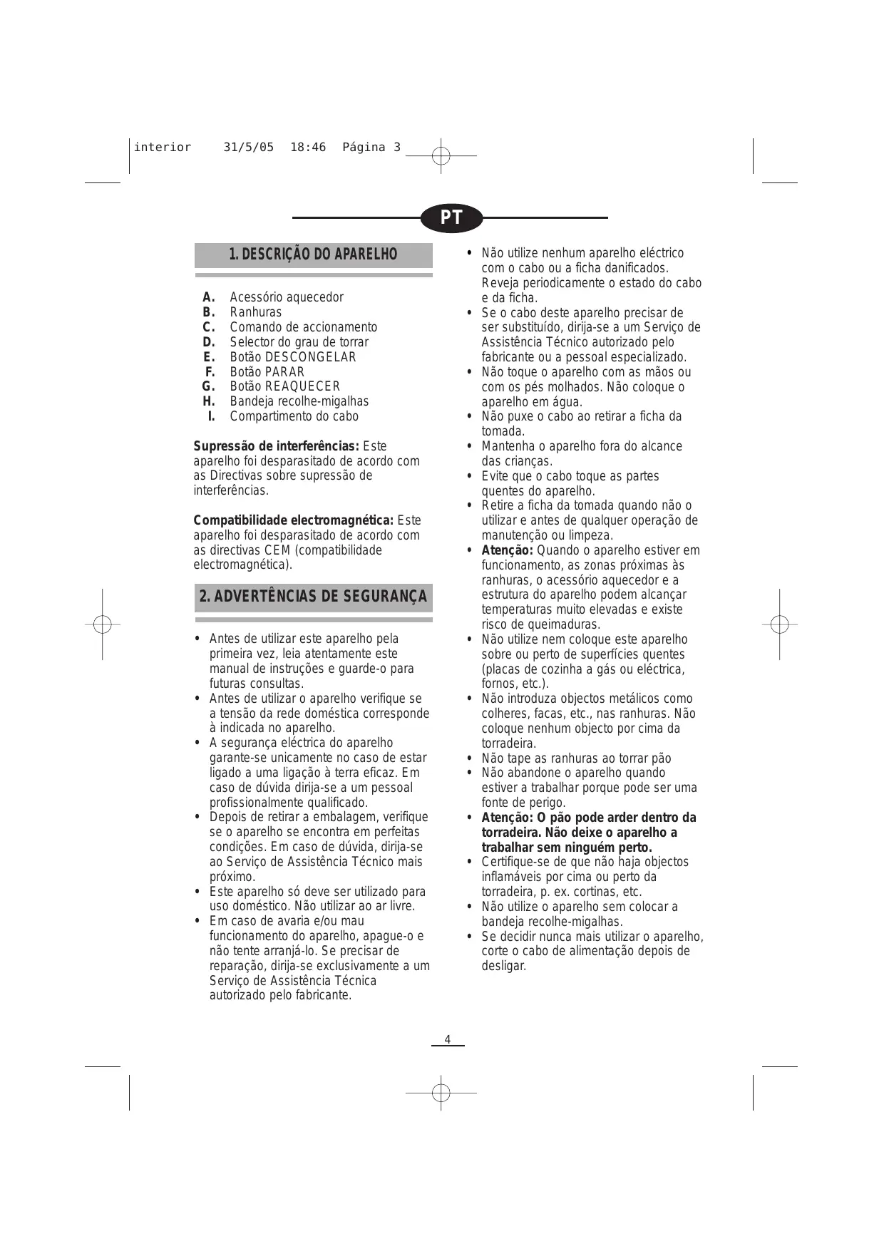 - Se decidir nunca mais utilizar o aparelho, corte o cabo de alimentação depois de desligar. Acessório aquecedor Ranhuras Comando de accionamento Selector do grau de torrar Botão DESCONGELAR Botão PARAR Botão REAQUECER Bandeja recolhe-migalhas Compartimento do cabo Supressão de interferências: Este aparelho foi desparasitado de acordo com as Directivas sobre supressão de interferências. Compatibilidade electromagnética: Este aparelho foi desparasitado de acordo com as directivas CEM (compatibilidade electromagnética).