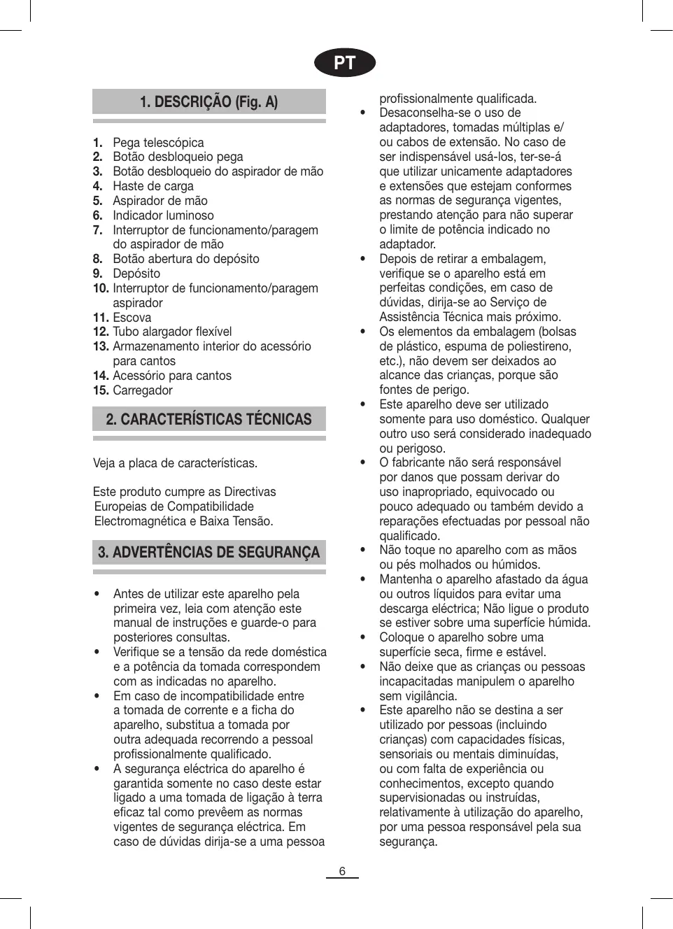 As crianças devem ser mantidas sob vigilância para garantir que não brincam com o aparelho. Para uma maior protecção, recomendase a instalação de um dispositivo de corrente residual (RCD) com uma corrente residual operacional que não supere os 30 mA. Aconselhe-se com o técnico de instalação. Não abandonar o aparelho aceso porque pode ser fonte de perigo. Ao desligar a cavilha nunca puxe do cabo. Desligue o aparelho antes de efectuar qualquer operação de limpeza ou manutenção. Em caso de avaria ou mau funcionamento do aparelho e sempre que não o utilizar, desligue-o e não o repare. No caso de necessitar de reparação dirigir-se unicamente a um Serviço de Assistência Técnica autorizado pelo fabricante e solicitar o uso de peças de substituição originais. Se o cabo deste aparelho estiver danificado, dirija-se a um Centro de Assistência técnico autorizado para que o substituam. Não deixe o aparelho exposto aos agentes atmosféricos (chuva, sol, gelo etc.). Não utilize ou coloque nenhuma parte deste aparelho sobre ou próximo de superfícies quentes (placas de cozinha de gás ou eléctrica, fornos). Não utilize detergentes ou baetas abrasivas para limpar a unidade. Não toque as superfícies quentes. Utilize as pegas ou flexores. Evite que o cabo toque nas partes quentes do aparelho. Não aspire água nem nenhum outro líquido. Certifique-se de que os interruptores de funcionamento/paragem do aspirador e do aspirador de mão estão na posição de desligado antes de o colocar a carregar. Recomendamos que mude o filtro do depósito para a sujidade a cada três a seis meses, dependendo da utilização, para assegurar o rendimento máximo da unidade.