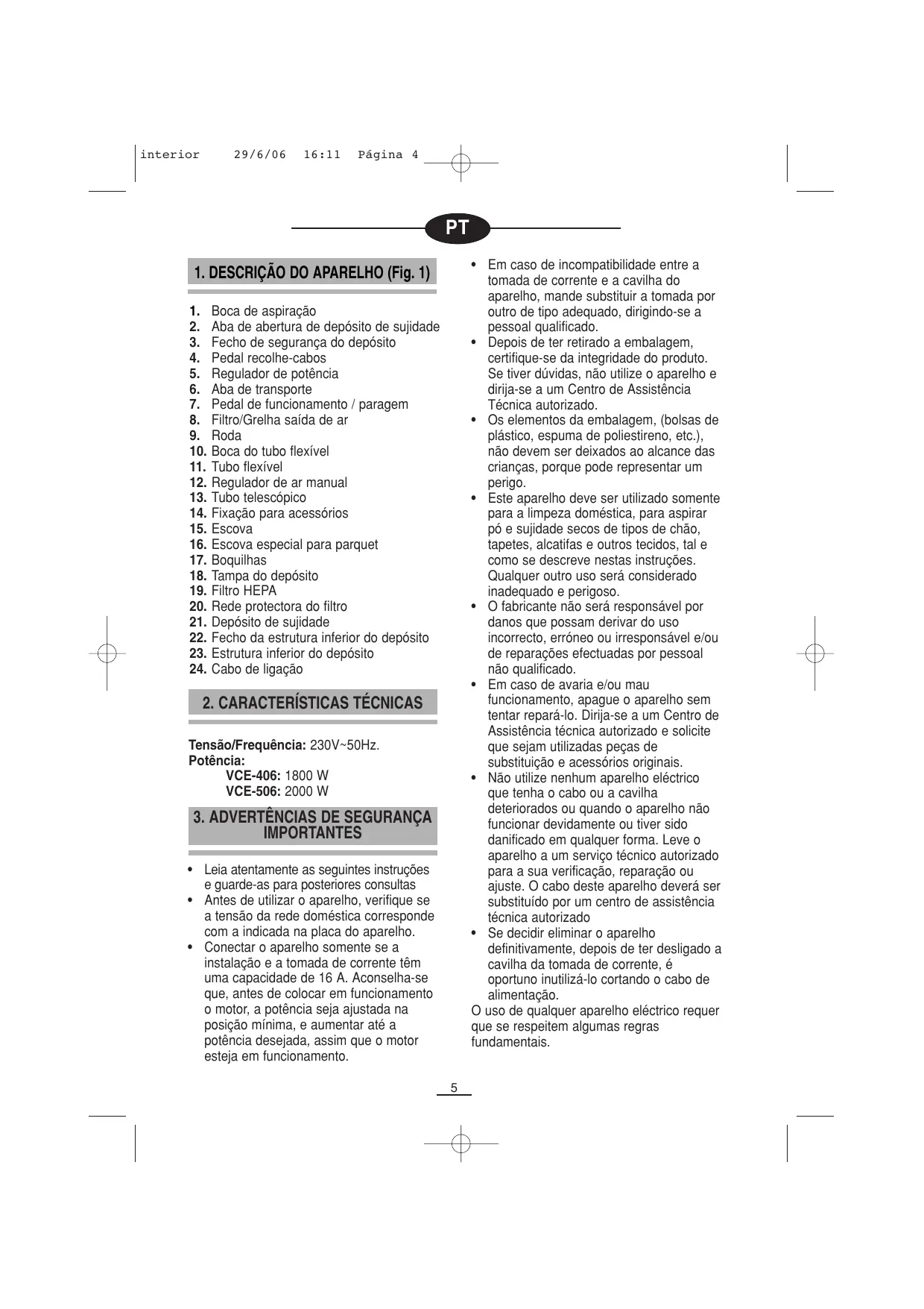 - Este aparelho deve ser utilizado somente para a limpeza doméstica, para aspirar pó e sujidade secos de tipos de chão, tapetes, alcatifas e outros tecidos, tal e como se descreve nestas instruções. Qualquer outro uso será considerado inadequado e perigoso.