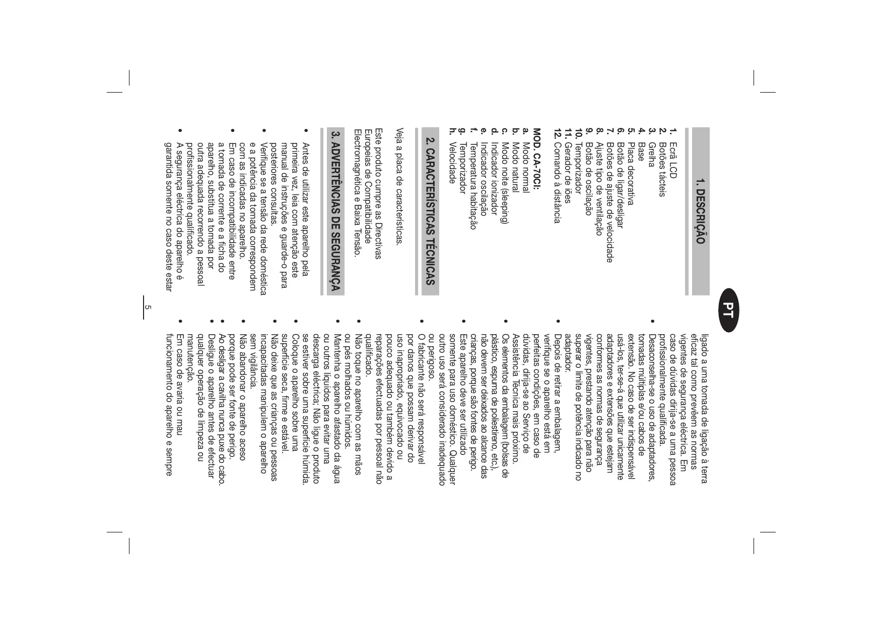 Alto Médio Baixo Alto Médio Baixo Alto Médio Baixo MODO NOITE Velocidade baixa Velocidade média Velocidade alta 1 h. x 8 Oscilação: Prima o botão de oscilação (9) (o mod. CA-70CI “e”) (o mod. CA-60C acende o indicador luminoso de oscilação) para fazer com que o ventilador oscile na direcção horizontal e assim arrefecer os espaços maiores de uma forma eficaz. Se desejar parar a oscilação, prima o botão uma segunda vez. Temporizador: Mod. CA-60C Prima o botão de temporizador (10) se desejar seleccionar um período de funcionamento de 1⁄2 hora a 7 horas e 1⁄2. Sempre que premir o botão de temporizador, o tempo irá aumentar em 1⁄2 hora. Depois de atingir as 7 horas e 1⁄2, se premir o botão temporizador (10) novamente, o ventilador voltará ao funcionamento contínuo. As luzes da parte superior indicam o período de tempo seleccionado. Depois de passar o tempo seleccionado, o ventilador desliga-se automaticamente. Mod. CA-70C Este ventilador tem um temporizador de um intervalo de 1 a 18 horas (g). Pode programá-lo de forma a que o ventilador se desligue automaticamente depois do tempo programado de funcionamento. Prima o botão temporizador (10) para programar o tempo. Sempre que premir o botão o tempo irá aumentar em meia hora. Deixe de premir quando obtiver o tempo desejado e o temporizador ficará programado. Para cancelar o temporizador, prima o botão até chegar a 0:00. Gerador de iões: Prima este botão (11) para activar a função iões. O ventilador vai emitir iões negativos para limpar e purificar o ar. Mod. CA-60C « A luz indica se está ou não activada esta função. Mod. CA-70 CI « O indicador de iões aparece no ecrã LCD (d). Prima de novo o botão para desactivar a função.