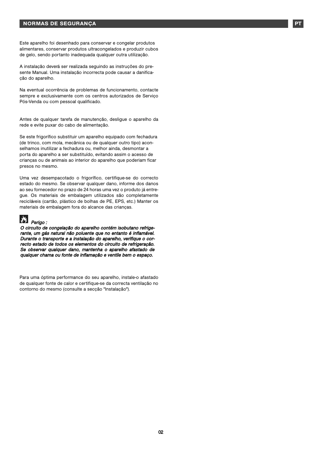 Este aparelho foi desenhado para conservar e congelar produtos alimentares, conservar produtos ultracongelados e produzir cubos de gelo, sendo portanto inadequada qualquer outra utilização. A instalação deverá ser realizada seguindo as instruções do presente Manual. Uma instalação incorrecta pode causar a danificação do aparelho. Na eventual ocorrência de problemas de funcionamento, contacte sempre e exclusivamente com os centros autorizados de Serviço Pós-Venda ou com pessoal qualificado. Antes de qualquer tarefa de manutenção, desligue o aparelho da rede e evite puxar do cabo de alimentação. Se este frigorífico substituir um aparelho equipado com fechadura (de trinco, com mola, mecânica ou de qualquer outro tipo) aconselhamos inutilizar a fechadura ou, melhor ainda, desmontar a porta do aparelho a ser substituído, evitando assim o acesso de crianças ou de animais ao interior do aparelho que poderiam ficar presos no mesmo. Uma vez desempacotado o frigorífico, certifique-se do correcto estado do mesmo. Se observar qualquer dano, informe dos danos ao seu fornecedor no prazo de 24 horas uma vez o produto já entregue. Os materiais de embalagem utilizados são completamente recicláveis (cartão, plástico de bolhas de PE, EPS, etc.) Manter os materiais de embalagem fora do alcance das crianças. Perigo : O circuito de congelação do aparelho contém isobutano refrigerante, um gás natural não poluente que no entanto é inflamável. Durante o transporte e a instalação do aparelho, verifique o correcto estado de todos os elementos do circuito de refrigeração. Se observar qualquer dano, mantenha o aparelho afastado de qualquer chama ou fonte de inflamação e ventile bem o espaço. Para uma óptima performance do seu aparelho, instale-o afastado de qualquer fonte de calor e certifique-se da correcta ventilação no contorno do mesmo (consulte a secção "Instalação").
