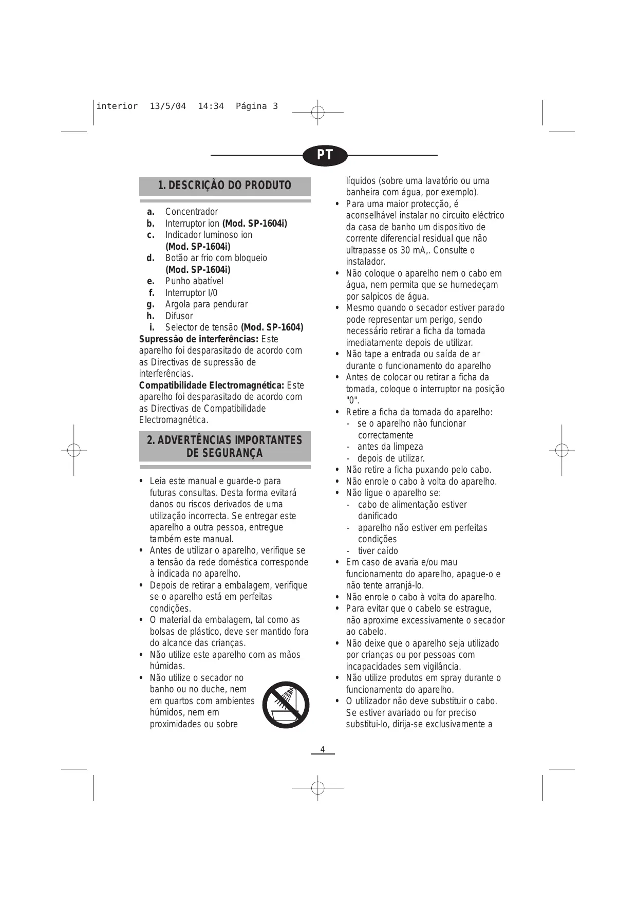 Concentrador Interruptor ion (Mod. SP-1604i) Indicador luminoso ion (Mod. SP-1604i) d. Botão ar frio com bloqueio (Mod. SP-1604i) e. Punho abatível f. Interruptor I/0 g. Argola para pendurar h. Difusor i. Selector de tensão (Mod. SP-1604) Supressão de interferências: Este aparelho foi desparasitado de acordo com as Directivas de supressão de interferências. Compatibilidade Electromagnética: Este aparelho foi desparasitado de acordo com as Directivas de Compatibilidade Electromagnética.