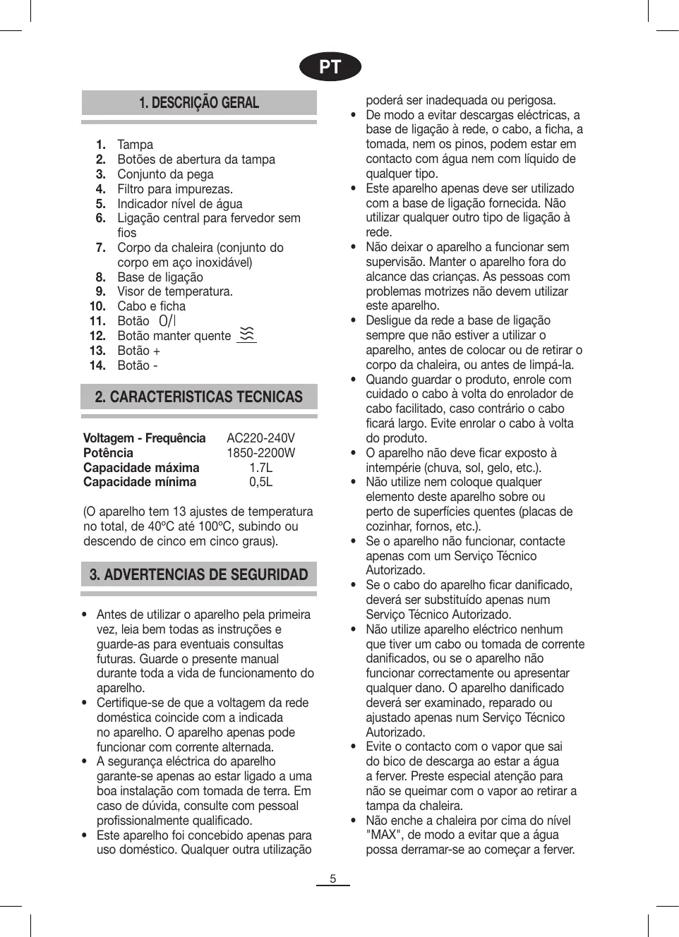 PT poderá ser inadequada ou perigosa. • De modo a evitar descargas eléctricas, a base de ligação à rede, o cabo, a ficha, a tomada, nem os pinos, podem estar em contacto com água nem com líquido de qualquer tipo. • Este aparelho apenas deve ser utilizado com a base de ligação fornecida. Não utilizar qualquer outro tipo de ligação à rede. • Não deixar o aparelho a funcionar sem supervisão. Manter o aparelho fora do alcance das crianças. As pessoas com problemas motrizes não devem utilizar este aparelho. • Desligue da rede a base de ligação sempre que não estiver a utilizar o aparelho, antes de colocar ou de retirar o corpo da chaleira, ou antes de limpá-la. • Quando guardar o produto, enrole com cuidado o cabo à volta do enrolador de cabo facilitado, caso contrário o cabo ficará largo. Evite enrolar o cabo à volta do produto. • O aparelho não deve ficar exposto à intempérie (chuva, sol, gelo, etc.). • Não utilize nem coloque qualquer elemento deste aparelho sobre ou perto de superfícies quentes (placas de cozinhar, fornos, etc.). • Se o aparelho não funcionar, contacte apenas com um Serviço Técnico Autorizado. • Se o cabo do aparelho ficar danificado, deverá ser substituído apenas num Serviço Técnico Autorizado. • Não utilize aparelho eléctrico nenhum que tiver um cabo ou tomada de corrente danificados, ou se o aparelho não funcionar correctamente ou apresentar qualquer dano. O aparelho danificado deverá ser examinado, reparado ou ajustado apenas num Serviço Técnico Autorizado. • Evite o contacto com o vapor que sai do bico de descarga ao estar a água a ferver. Preste especial atenção para não se queimar com o vapor ao retirar a tampa da chaleira. • Não enche a chaleira por cima do nível "MAX", de modo a evitar que a água possa derramar-se ao começar a ferver.