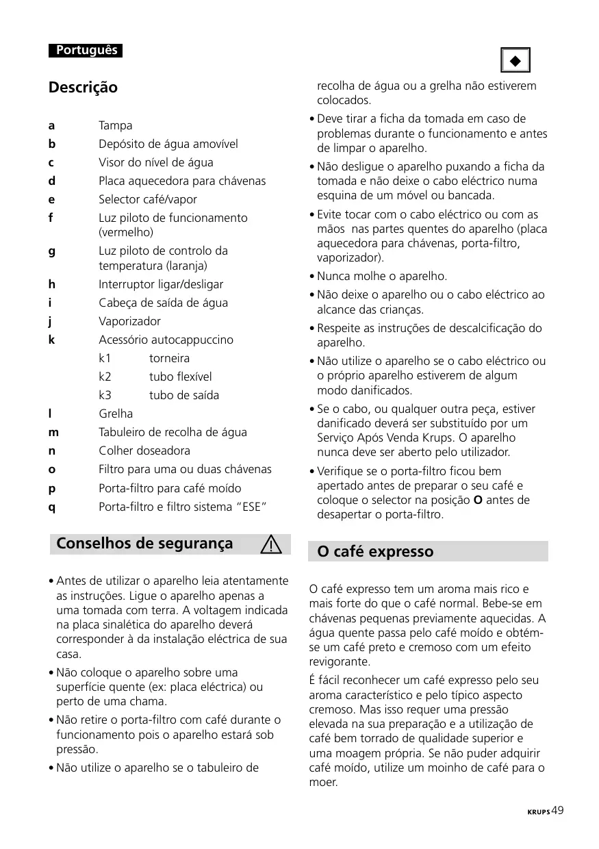 - Se o cabo, ou qualquer outra peça, estiver danificado deverá ser substituído por um Serviço Após Venda Krups. O aparelho nunca deve ser aberto pelo utilizador.