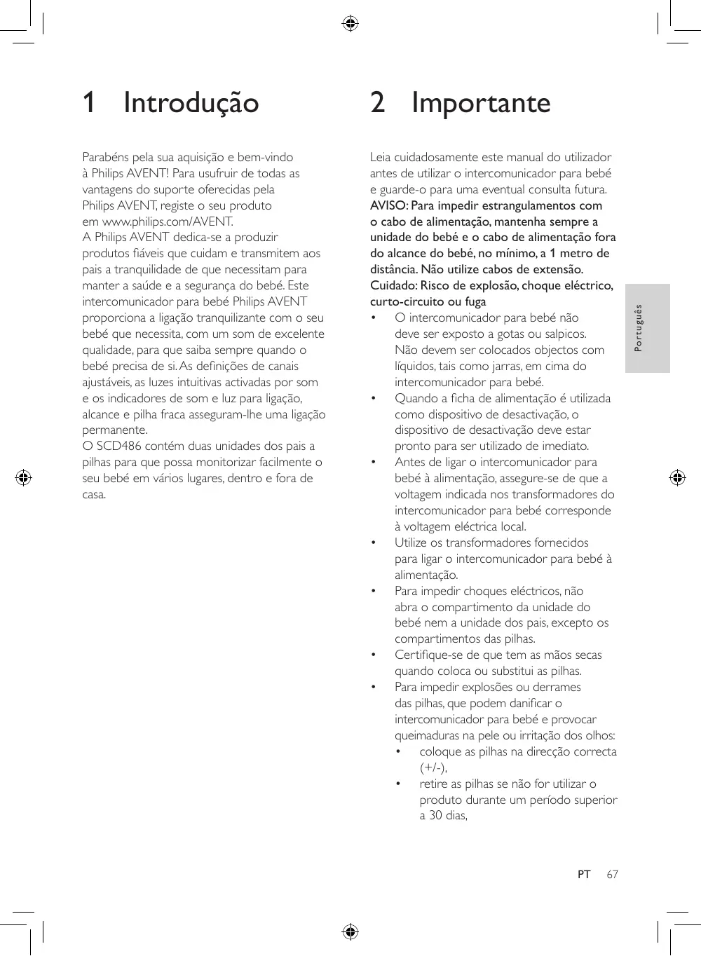 Løsninger Koble enheten til et strømuttak. Bytt ut batteriene, og sørg for at de nye settes inn riktig. Still enhetene inn på samme kanal. Flytt enhetene nærmere hverandre (se ‘Driftsrekkevidde’ på side 65). Flytt foreldreenheten lenger vekk fra babyenheten. Senk volumet på foreldreenheten. Flytt foreldreenheten vekk fra andre elektriske apparater som mikrobølgeovner eller telefoner. Bytt kanal på enhetene. Flytt enhetene nærmere hverandre. Still enhetene inn på samme kanal. Koble foreldre- og/eller babyenheten til et strømuttak. Skift ut batteriene. Øk volumet på foreldreenheten. Flytt enhetene nærmere hverandre. Flytt enhetene nærmere hverandre. Reduser volumet. 2 Importante Parabéns pela sua aquisição e bem-vindo à Philips AVENT! Para usufruir de todas as vantagens do suporte oferecidas pela Philips AVENT, registe o seu produto em www.philips.com/AVENT. A Philips AVENT dedica-se a produzir produtos fiáveis que cuidam e transmitem aos pais a tranquilidade de que necessitam para manter a saúde e a segurança do bebé. Este intercomunicador para bebé Philips AVENT proporciona a ligação tranquilizante com o seu bebé que necessita, com um som de excelente qualidade, para que saiba sempre quando o bebé precisa de si. As definições de canais ajustáveis, as luzes intuitivas activadas por som e os indicadores de som e luz para ligação, alcance e pilha fraca asseguram-lhe uma ligação permanente. O SCD486 contém duas unidades dos pais a pilhas para que possa monitorizar facilmente o seu bebé em vários lugares, dentro e fora de casa. Leia cuidadosamente este manual do utilizador antes de utilizar o intercomunicador para bebé e guarde-o para uma eventual consulta futura. AVISO: Para impedir estrangulamentos com o cabo de alimentação, mantenha sempre a unidade do bebé e o cabo de alimentação fora do alcance do bebé, no mínimo, a 1 metro de distância. Não utilize cabos de extensão. Cuidado: Risco de explosão, choque eléctrico, curto-circuito ou fuga