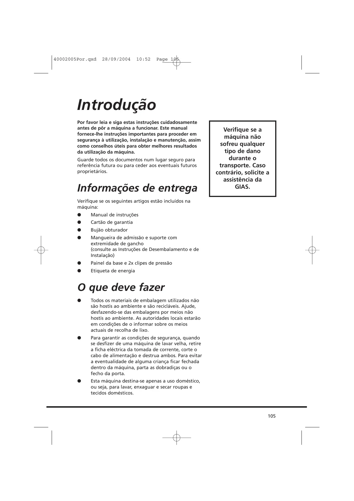 40002005Por.qxd 28/09/2004 10:52 Page 105 Introdução Por favor leia e siga estas instruções cuidadosamente antes de pôr a máquina a funcionar. Este manual fornece-lhe instruções importantes para proceder em segurança à utilização, instalação e manutenção, assim como conselhos úteis para obter melhores resultados da utilização da máquina. Guarde todos os documentos num lugar seguro para referência futura ou para ceder aos eventuais futuros proprietários. Informações de entrega Verifique se a máquina não sofreu qualquer tipo de dano durante o transporte. Caso contrário, solicite a assistência da GIAS. Verifique se os seguintes artigos estão incluídos na máquina: