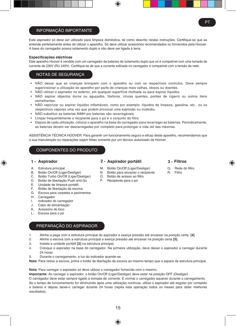ASSISTÊNCIA TÉCNICA HOOVER: Para garantir um funcionamento seguro e eficaz deste aparelho, recomendamos que a sua manutenção ou reparações sejam feitas somente por um técnico autorizado da Hoover.