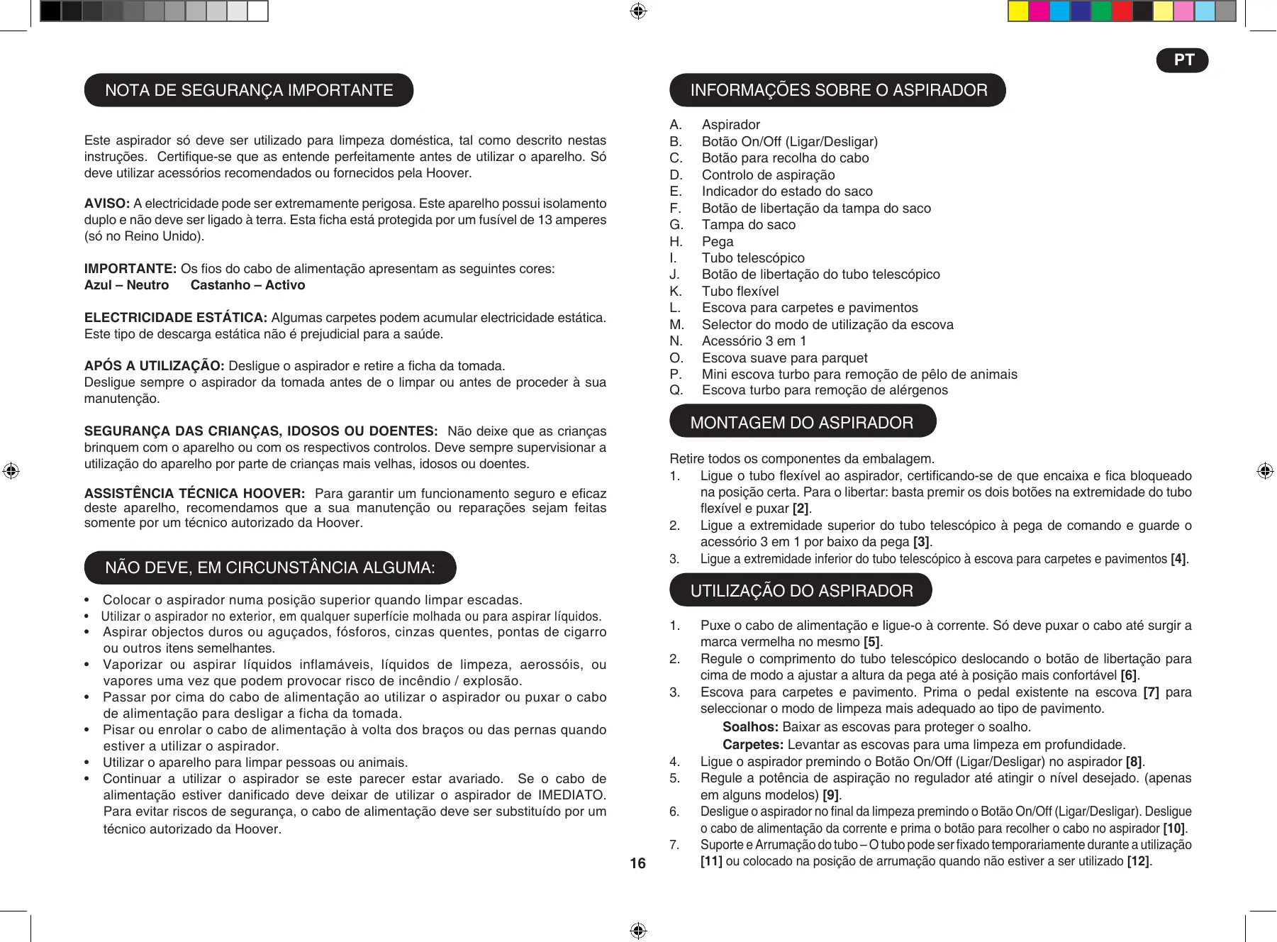Este aspirador só deve ser utilizado para limpeza doméstica, tal como descrito nestas instruções. Certifique-se que as entende perfeitamente antes de utilizar o aparelho. Só deve utilizar acessórios recomendados ou fornecidos pela Hoover. Aviso: A electricidade pode ser extremamente perigosa. Este aparelho possui isolamento duplo e não deve ser ligado à terra. Esta ficha está protegida por um fusível de 13 amperes (só no Reino Unido). Importante: Os fios do cabo de alimentação apresentam as seguintes cores: Azul – Neutro Castanho – Activo ELECTRICIDADE ESTÁTICA: Algumas carpetes podem acumular electricidade estática. Este tipo de descarga estática não é prejudicial para a saúde. APÓS A UTILIZAÇÃO: Desligue o aspirador e retire a ficha da tomada. Desligue sempre o aspirador da tomada antes de o limpar ou antes de proceder à sua manutenção. Aspirador Botão On/Off (Ligar/Desligar) Botão para recolha do cabo Controlo de aspiração Indicador do estado do saco Botão de libertação da tampa do saco Tampa do saco Pega Tubo telescópico Botão de libertação do tubo telescópico Tubo flexível Escova para carpetes e pavimentos Selector do modo de utilização da escova Acessório 3 em 1 Escova suave para parquet Mini escova turbo para remoção de pêlo de animais Escova turbo para remoção de alérgenos Montagem do aspirador Segurança das crianças, idosos ou doentes: Não deixe que as crianças brinquem com o aparelho ou com os respectivos controlos. Deve sempre supervisionar a utilização do aparelho por parte de crianças mais velhas, idosos ou doentes. Retire todos os componentes da embalagem. Ligue o tubo flexível ao aspirador, certificando-se de que encaixa e fica bloqueado na posição certa. Para o libertar: basta premir os dois botões na extremidade do tubo flexível e puxar [2]. Ligue a extremidade superior do tubo telescópico à pega de comando e guarde o acessório 3 em 1 por baixo da pega [3]. Ligue a extremidade inferior do tubo telescópico à escova para carpetes e pavimentos [4]. ASSISTÊNCIA TÉCNICA HOOVER: Para garantir um funcionamento seguro e eficaz deste aparelho, recomendamos que a sua manutenção ou reparações sejam feitas somente por um técnico autorizado da Hoover. Não deve, em circunstância alguma: Utilização do aspirador