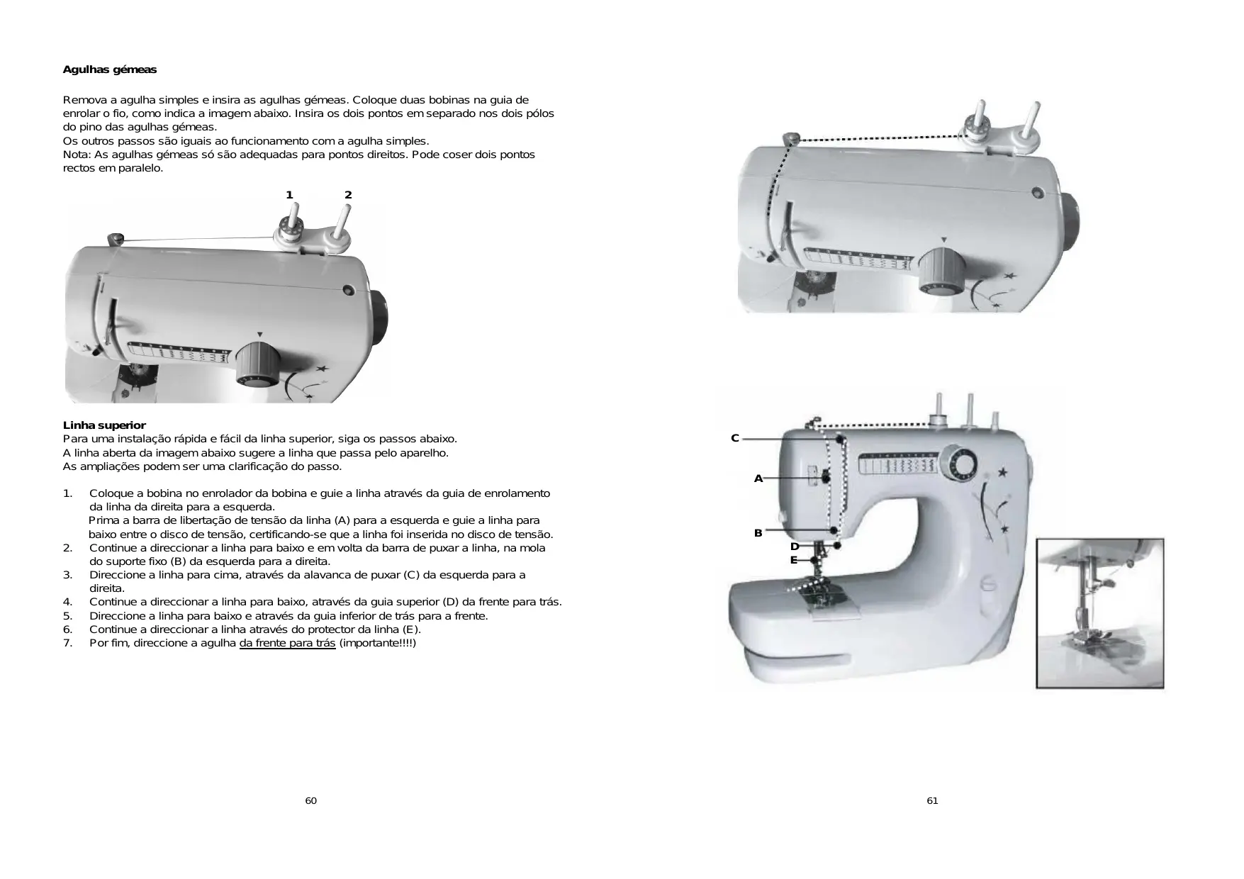 Coloque a bobina no enrolador da bobina e guie a linha através da guia de enrolamento da linha da direita para a esquerda. Prima a barra de libertação de tensão da linha (A) para a esquerda e guie a linha para baixo entre o disco de tensão, certificando-se que a linha foi inserida no disco de tensão. Continue a direccionar a linha para baixo e em volta da barra de puxar a linha, na mola do suporte fixo (B) da esquerda para a direita. Direccione a linha para cima, através da alavanca de puxar (C) da esquerda para a direita. Continue a direccionar a linha para baixo, através da guia superior (D) da frente para trás. Direccione a linha para baixo e através da guia inferior de trás para a frente. Continue a direccionar a linha através do protector da linha (E). Por fim, direccione a agulha da frente para trás (importante!!!!)