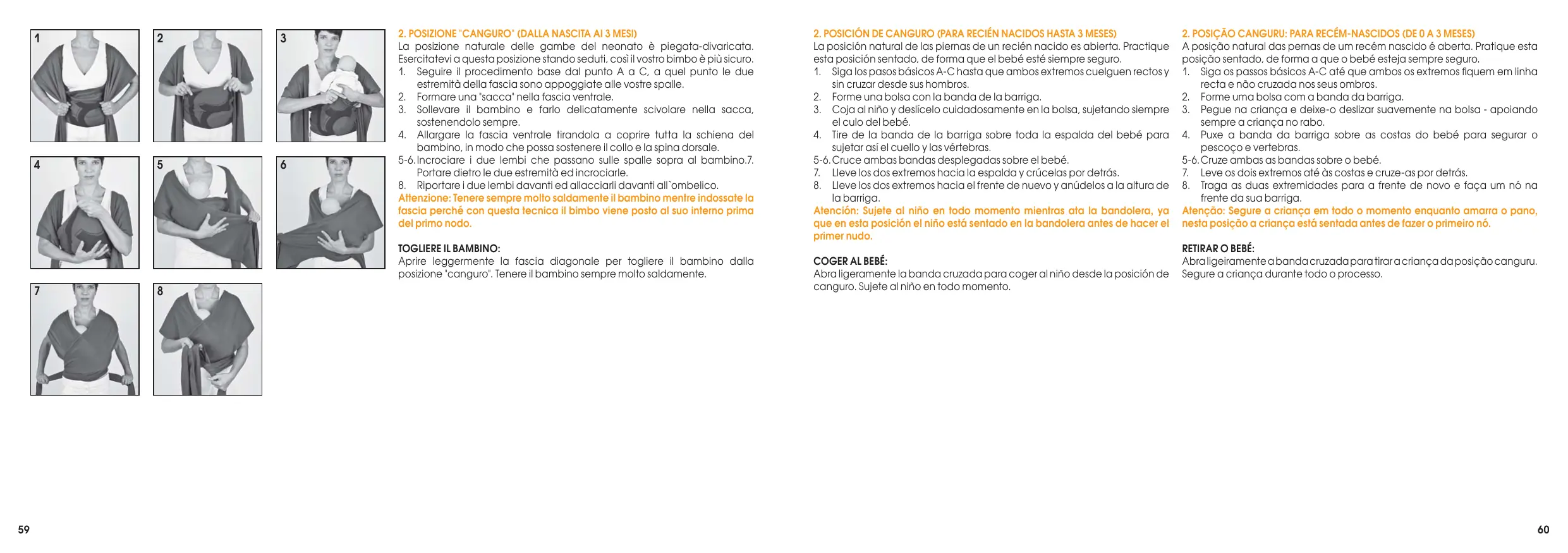 2. Soulevez votre bébé en l'attirant sur votre épaule droite, face à vous, et tirez la bande de gauche sur la jambre droite de l'enfant. 3. Placez ensuite votre bébé sur votre épaule droite et tirez la bande de droite sur sa jambe gauche. 4. Dépliez la bande croisée intérieure (celle qui en contact direct avec le dos de l'enfant) jusqu'à ce qu'elle soutienne bien l'arrière de ses genoux. 5-6. Faites glisser l'enfant jusqu'à votre hanche droite. Laissez suivre la bande croisée. 7. Dépliez maintenant la bande croisée extérieure entre les genoux de l'enfant. 8. Tirez la bande ventrale d'abord sur les jambes puis sur tout le dos de l'enfant. NOTE: Selon l'âge et la préférence de l'enfant, ses bras peuvent être placés à l'intérieur ou à l'extérieur de la bande ventrale SORTIR L'ENFANT DE L'ÉCHARPE: Ouvrez légèrement la bande croisée pour dégager l'enfant de la position assise. Tenez bien l'enfant en permanence.