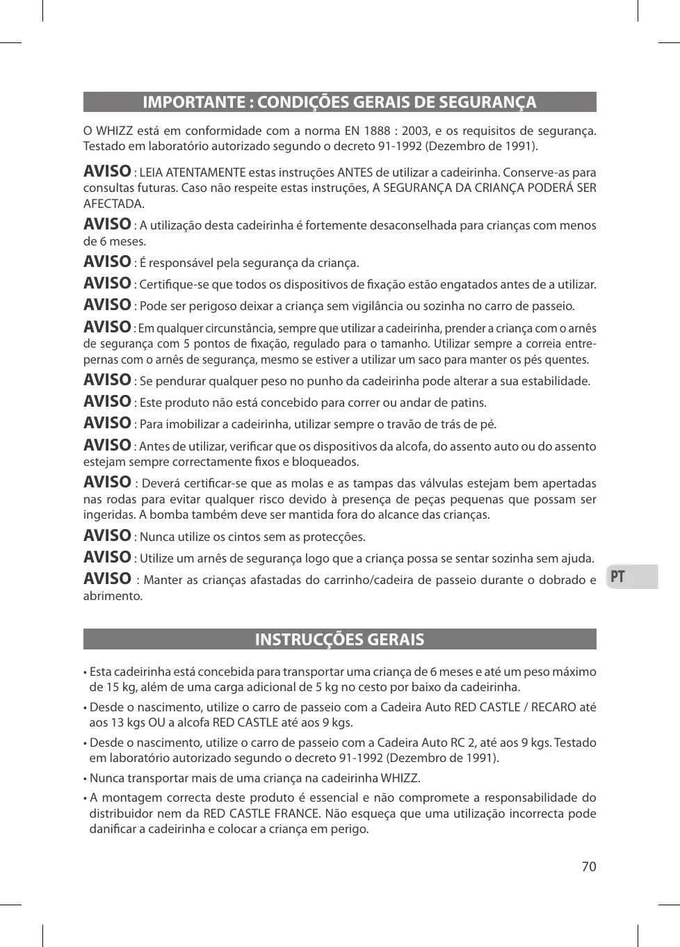 • Cette poussette est conçue pour transporter un enfant âgé de 6 mois et jusqu’à un poids maximum de 15 kg, ainsi qu’une charge additionnelle de 5 kg dans le panier sous la poussette. • Dès la naissance, utilisez la poussette en combiné avec le Siège Auto RED CASTLE / RECARO Groupe 0+ jusqu’à 13 kg OU avec la nacelle RED CASTLE jusqu’à 9 kg. • Dès la naissance, utilisez la poussette en combiné avec le Siège Auto RC 2 Groupe 0 jusqu’à 9 kg. Ce combiné est conforme aux exigences de sécurité et a été testé en laboratoire agréé selon le décret 91-1992 (décembre 1991). • N’utilisez pas cette poussette avant que votre enfant soit capable de se maintenir assis sans aide (à partir de 6 mois).