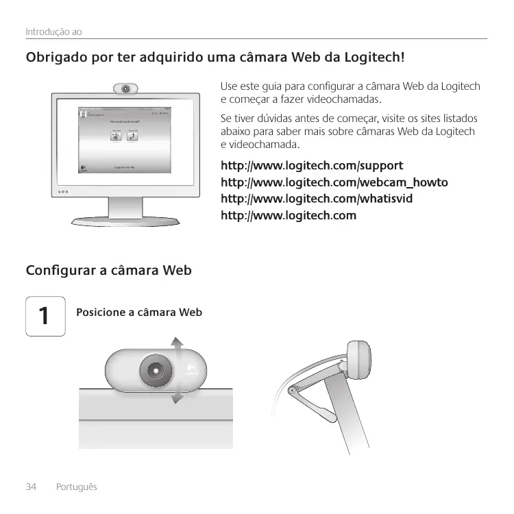 (FUUJOHTUBSUFEXJUI Première utilisation -PHJUFDI8FCDBN$ JPO SNBU JOGP SUBOU *NQP J5IJ UFDI -PHJ OUZ MJBODF BSSB BOEX DPNQ 4BGFUZ SFODF EJGGF BLFB UTN NFO DPN :PVS Português 33 Introdução ao Obrigado por ter adquirido uma câmara Web da Logitech! Use este guia para configurar a câmara Web da Logitech e começar a fazer videochamadas. Se tiver dúvidas antes de começar, visite os sites listados abaixo para saber mais sobre câmaras Web da Logitech e videochamada. Configurar a câmara Web