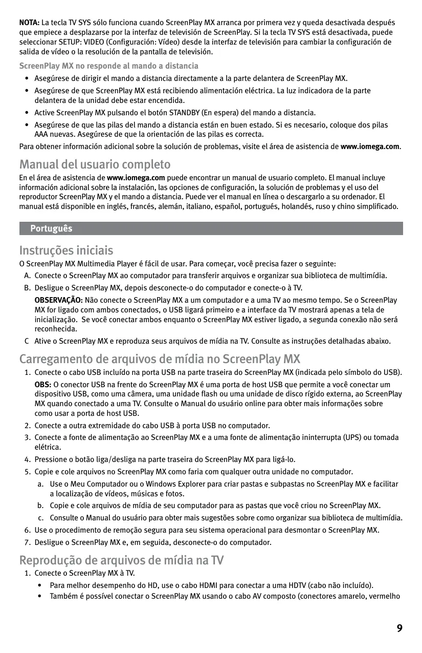 - Asegúrese de que las pilas del mando a distancia están en buen estado. Si es necesario, coloque dos pilas AAA nuevas. Asegúrese de que la orientación de las pilas es correcta. Para obtener información adicional sobre la solución de problemas, visite el área de asistencia de www.iomega.com. Manual del usuario completo En el área de asistencia de www.iomega.com puede encontrar un manual de usuario completo. El manual incluye información adicional sobre la instalación, las opciones de configuración, la solución de problemas y el uso del reproductor ScreenPlay MX y el mando a distancia. Puede ver el manual en línea o descargarlo a su ordenador. El manual está disponible en inglés, francés, alemán, italiano, español, portugués, holandés, ruso y chino simplificado. Instruções iniciais O ScreenPlay MX Multimedia Player é fácil de usar. Para começar, você precisa fazer o seguinte: A. Conecte o ScreenPlay MX ao computador para transferir arquivos e organizar sua biblioteca de multimídia. B. Desligue o ScreenPlay MX, depois desconecte-o do computador e conecte-o à TV. OBSERVAÇÃO: Não conecte o ScreenPlay MX a um computador e a uma TV ao mesmo tempo. Se o ScreenPlay MX for ligado com ambos conectados, o USB ligará primeiro e a interface da TV mostrará apenas a tela de inicialização. Se você conectar ambos enquanto o ScreenPlay MX estiver ligado, a segunda conexão não será reconhecida. C Ative o ScreenPlay MX e reproduza seus arquivos de mídia na TV. Consulte as instruções detalhadas abaixo. Carregamento de arquivos de mídia no ScreenPlay MX