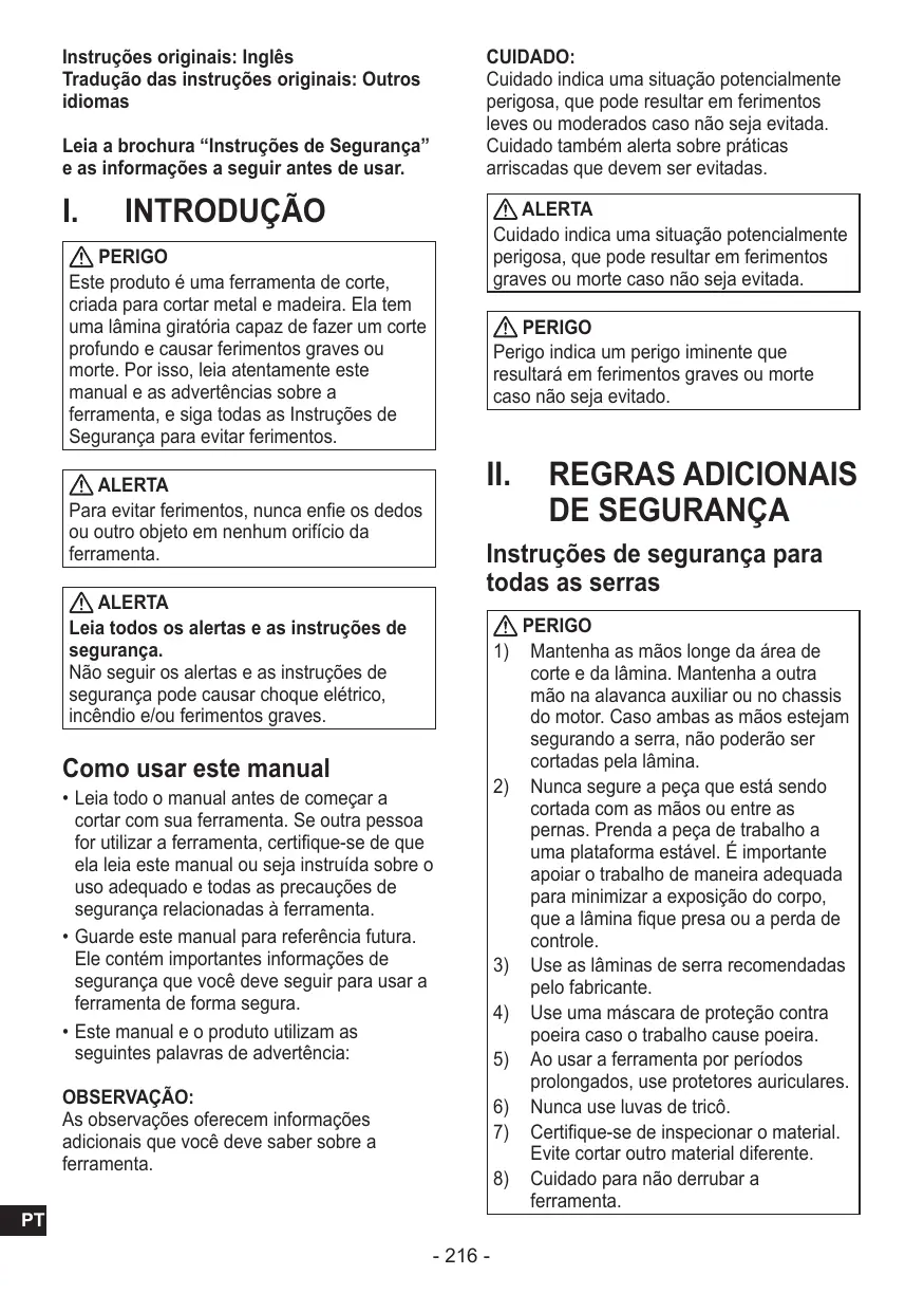 Para registrar ferimentos graves, sempre remove o Conjunto de baterias da ferramenta antes de iniciar qualquer procedimento de manutenção.