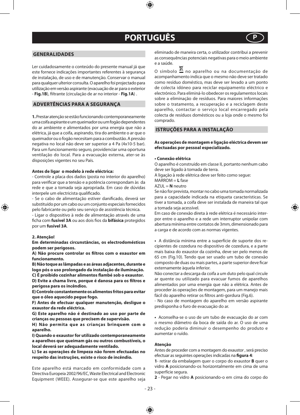 Ler cuidadosamente o conteudo do presente manual ja que este fornecceopenhagenasimportantesreferentesa segurarac de instalacao,de uso e de manutenao.Consvaro umanal para qualquer ulterior consulta.O aparelho foi projectado parautilização em versao aspirante (evacuação de ar para o exterior- Fig.1B),filtrante (circulação de ar no interior -Fig.1A).