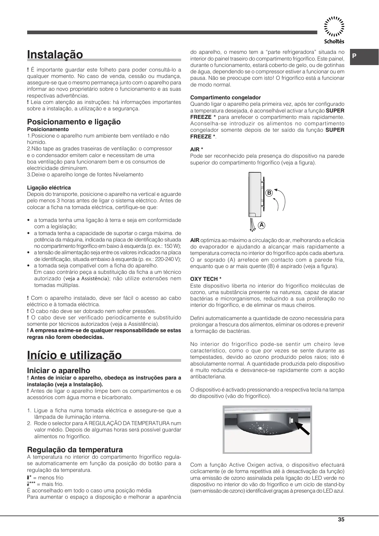 B A AIR optimiza ao máximo a circulação do ar, melhorando a eficácia do evaporador e ajudando a alcançar mais rapidamente a temperatura correcta no interior do frigorífico após cada abertura. O ar soprado (A) arrefece em contacto com a parede fria, enquanto que o ar mais quente (B) é aspirado (veja a figura). OXY TECH * Este dispositivo liberta no interior do frigorífico moléculas de ozono, uma substância presente na natureza, capaz de atacar bactérias e microrganismos, reduzindo a sua proliferação no interior do frigorífico, e de eliminar os maus cheiros. Defini automaticamente a quantidade de ozono necessária para prolongar a frescura dos alimentos, eliminar os odores e prevenir a formação de bactérias. No interior do frigorífico pode-se sentir um cheiro leve característico, como o que por vezes se sente durante as tempestades, devido ao ozono produzido pelos raios; isto é absolutamente normal. A quantidade produzida pelo dispositivo é muito reduzida e desvanece-se rapidamente com a acção antibacteriana. O dispositivo é activado pressionando a respectiva tecla na tampa do dispositivo (vão do frigorífico).