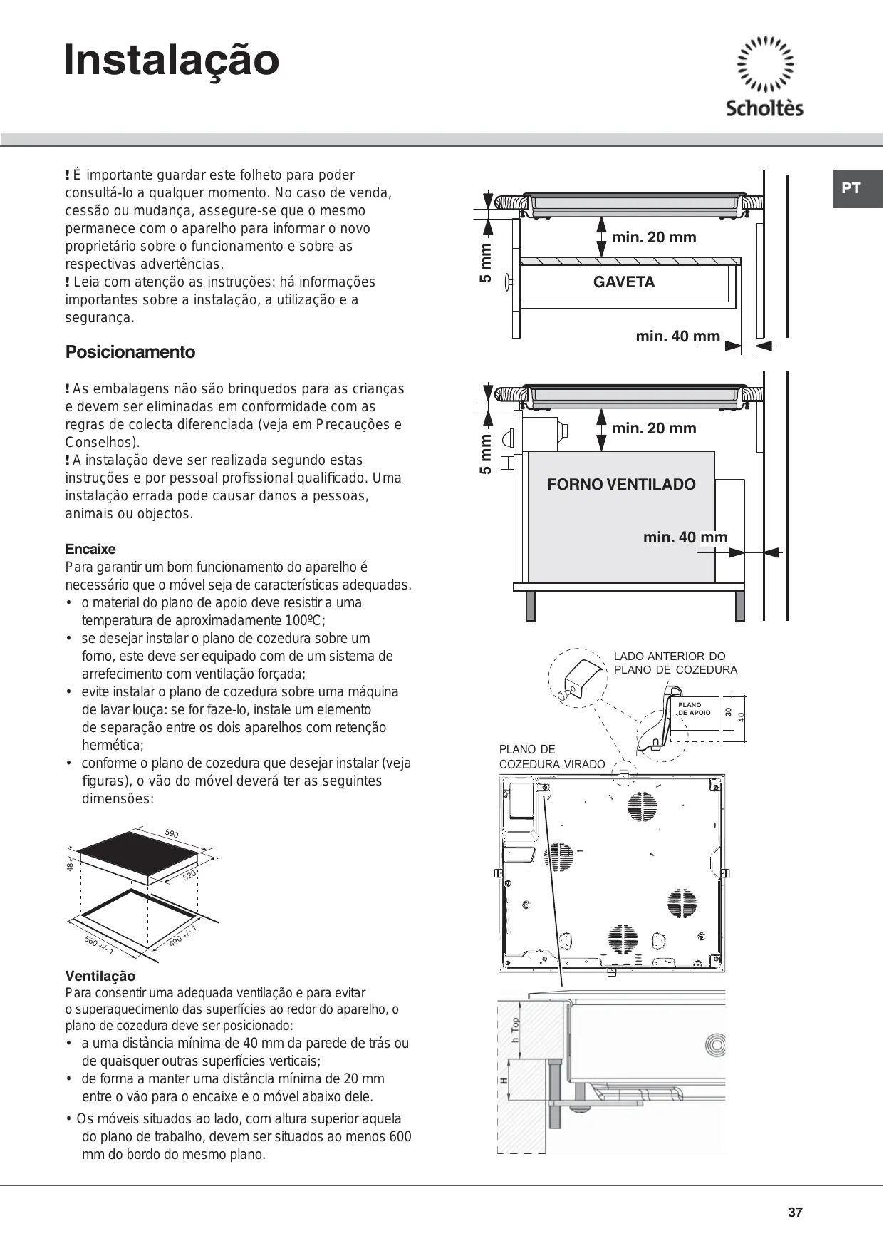 • a uma distância mínima de 40 mm da parede de trás ou de quaisquer outras superfícies verticais; • de forma a manter uma distância mínima de 20 mm entre o vão para o encaixe e o móvel abaixo dele. • Os móveis situados ao lado, com altura superior aquela do plano de trabalho, devem ser situados ao menos 600 mm do bordo do mesmo plano.
