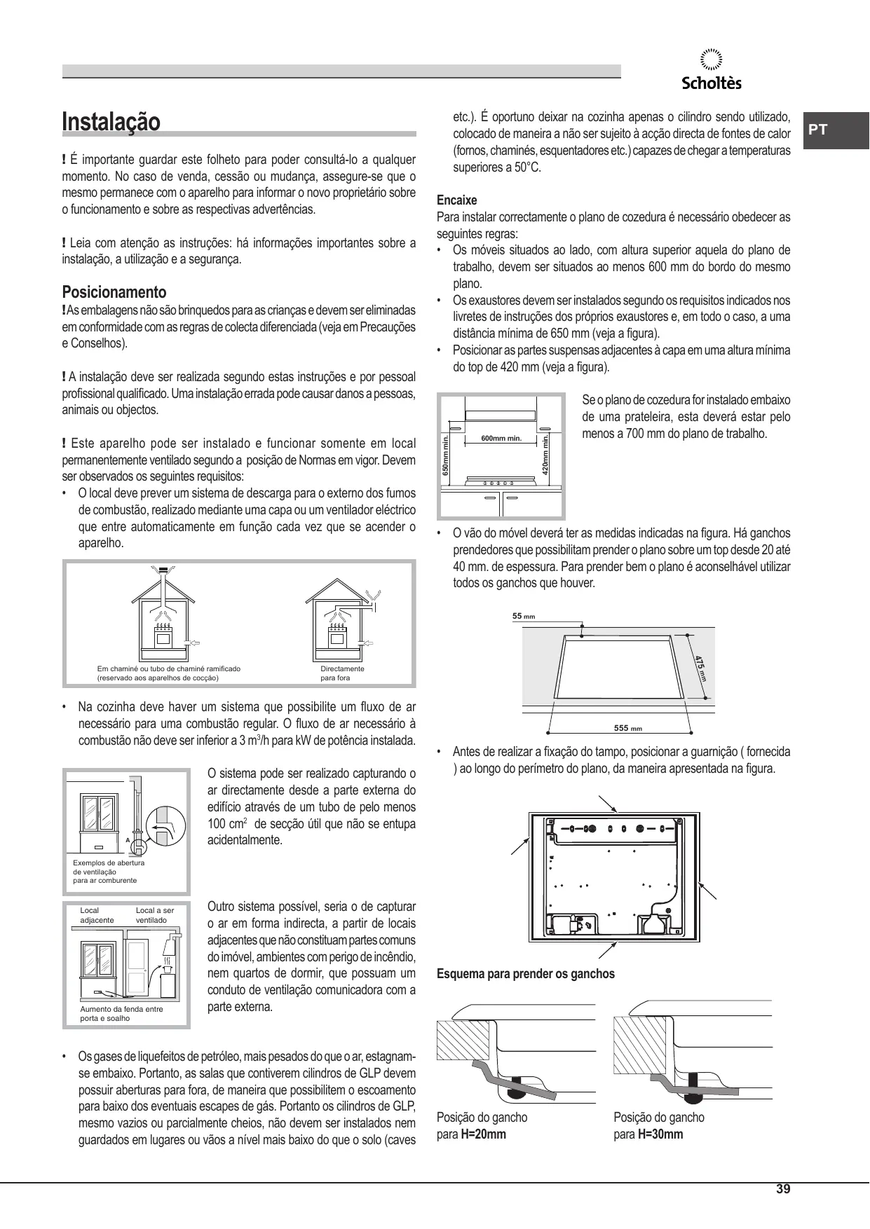 - O local deve prever um sistema de descarga para o externo dos fumos de combustão, realizado mediante uma capa ou um ventilador eléctrico que entre automaticamente em função cada vez que se acender o aparelho. 600mm min. 420mm min. ! Leia com atenção as instruções: há informações importantes sobre a instalação, a utilização e a segurança. Encaixe Para instalar correctamente o plano de cozedura é necessário obedecer as seguintes regras: