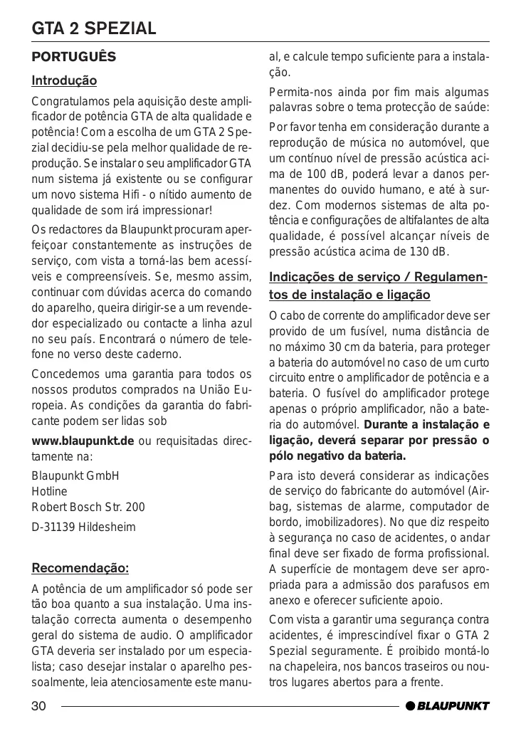 GTA 2 SPEZIAL PORTUGUÊS Introdução Congratulamos pela aquisição deste amplificador de potência GTA de alta qualidade e potência! Com a escolha de um GTA 2 Spezial decidiu-se pela melhor qualidade de reprodução. Se instalar o seu amplificador GTA num sistema já existente ou se configurar um novo sistema Hifi - o nítido aumento de qualidade de som irá impressionar! Os redactores da Blaupunkt procuram aperfeiçoar constantemente as instruções de serviço, com vista a torná-las bem acessíveis e compreensíveis. Se, mesmo assim, continuar com dúvidas acerca do comando do aparelho, queira dirigir-se a um revendedor especializado ou contacte a linha azul no seu país. Encontrará o número de telefone no verso deste caderno. Concedemos uma garantia para todos os nossos produtos comprados na União Europeia. As condições da garantia do fabricante podem ser lidas sob www.blaupunkt.de ou requisitadas directamente na: Blaupunkt GmbH Hotline Robert Bosch Str. 200 D-31139 Hildesheim
