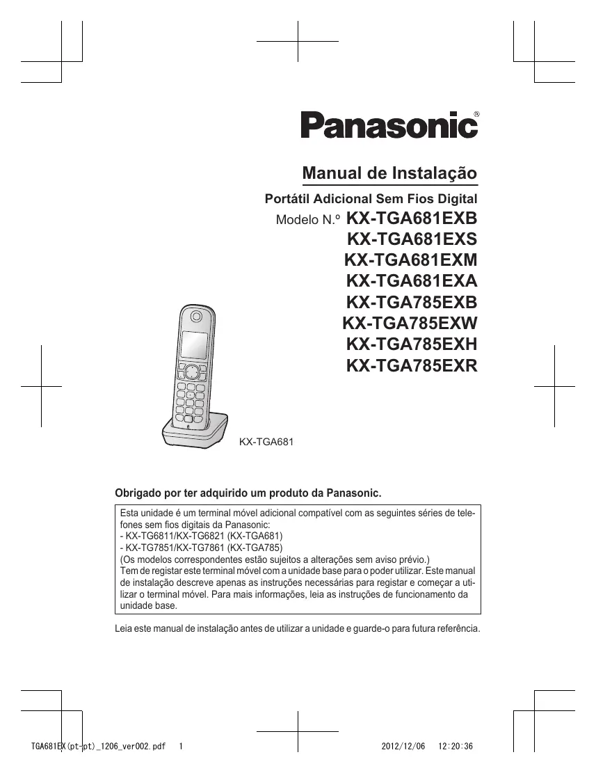 2012/12/06 12:17:03 Manual de Instalação Portátil Adicional Sem Fios Digital Modelo N.º KX-TGA681EXB KX-TGA681EXS KX-TGA681EXM KX-TGA681EXA KX-TGA785EXB KX-TGA785EXW KX-TGA785EXH KX-TGA785EXR KX-TGA681 Obrigado por ter adquirido um produto da Panasonic. Esta unidade é um terminal móvel adicional compatível com as seguintes séries de telefones sem fios digitais da Panasonic: - KX-TG6811/KX-TG6821 (KX-TGA681) - KX-TG7851/KX-TG7861 (KX-TGA785) (Os modelos correspondentes estão sujeitos a alterações sem aviso prévio.) Tem de registar este terminal móvel com a unidade base para o poder utilizar. Este manual de instalação descreve apenas as instruções necessárias para registar e começar a utilizar o terminal móvel. Para mais informações, leia as instruções de funcionamento da unidade base. Leia este manual de instalação antes de utilizar a unidade e guarde-o para futura referência. TGA681EX(pt-pt)_1206_ver002.pdf