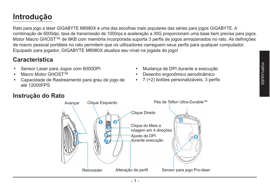 Introdução Rato para jogo a láser GIGABYTE M6980X é uma das escolhas mais populares das séries para jogos GIGABYTE. A combinação de 6000dpi, taxa de transmissão de 1000rps e aceleração a 30G proporcionam uma base bem precisa para jogos. Motor Macro GHOST™ de 8KB com memória incorporada suporta 3 perfis de jogos armazenados no rato. As definições de macro pessoal portáteis no rato permitem que os utilizadores carreguem seus perfis para qualquer computador. Equipado para jogador, GIGABYTE M6980X atualiza seu nível na jogada do jogo!