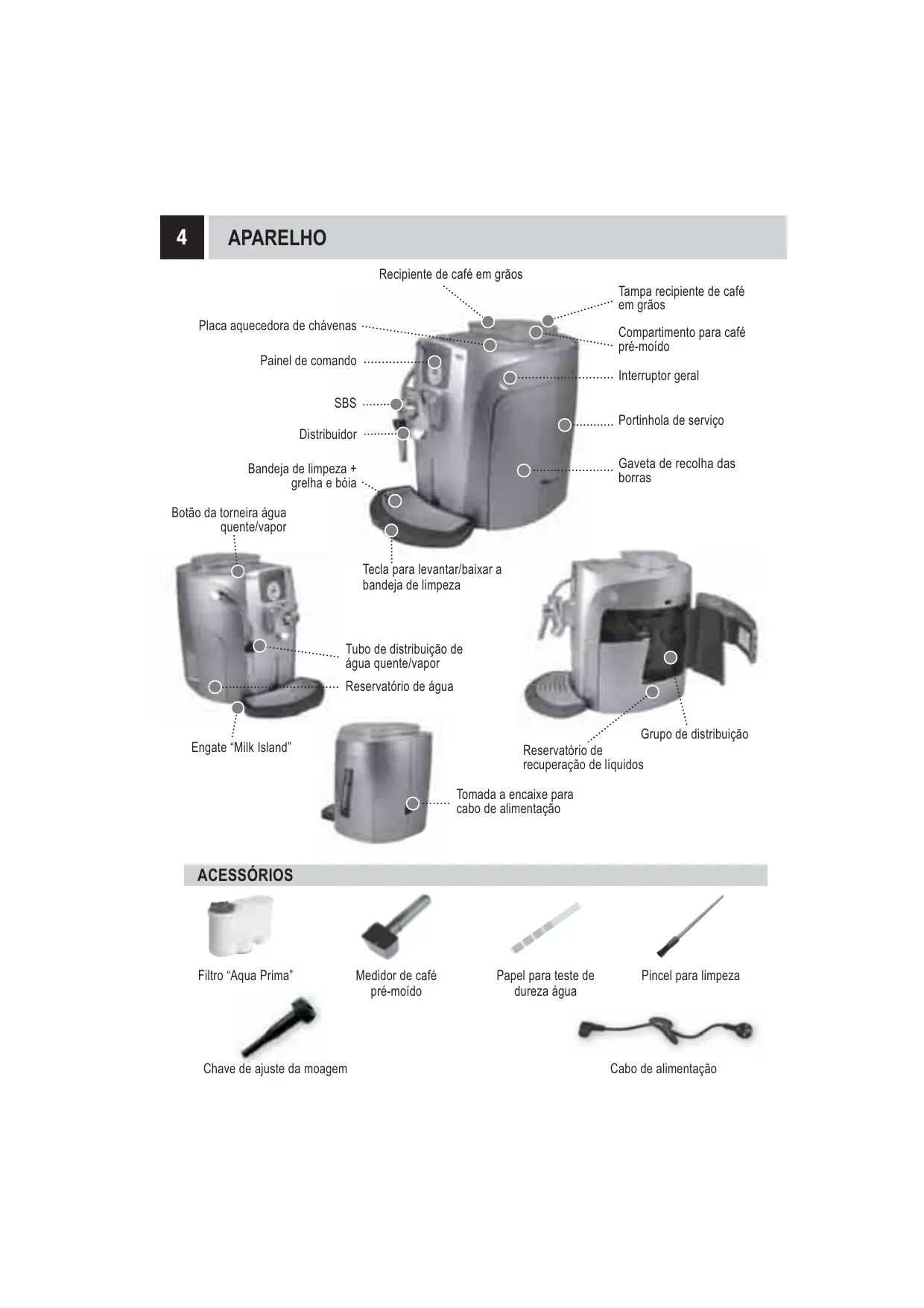 PERIGOS + O aparelho näo deve ser utlizado por crianças e pessoas no informadas sobre o seu funcionamento. + O aparelho estä perigoso para as crianças. Se ficar sem guarde, desligue-o da tomada de alimentaçäo. + Näo deixe os materials utlizados para a embalagem da mäquina ao alcance das crianças. + Näo dira para si e/ou para outros o jacto de vapor sobreaquecido elou de ägua quents: perigo de queimaduras. + Näo introduza objectos nas aberturas do aparelho (Perigo! Corrente eléctrical). + Näo toque na ficha com as méos e pés molhados, no retre-a da tomada puxando o cabo. + Atençäo: perigo de queimaduras pelo contacto com a qua quente, o vapor € o bico de ägua quente AVARIAS Näo utlize o aparelho no caso de avaria veriicada ou suspeita, por exemplo apés uma queda. Eventuais consertos deveräo ser realizados pelo servigo de assisténcia autorizado. Näo utlize um aparelho com cabo de almentaçäo defeituoso. Se o cabo de alimentaçäo estiver danifcado, deverä ser substituido pelo fabricante ou pelo seu servigo de assisténcia a0s clientes. (Perigo! Corrente eléctrical). Desligue 0 aparelho antes de abrir a portinhola de servigo. Perigo de queimaduras!