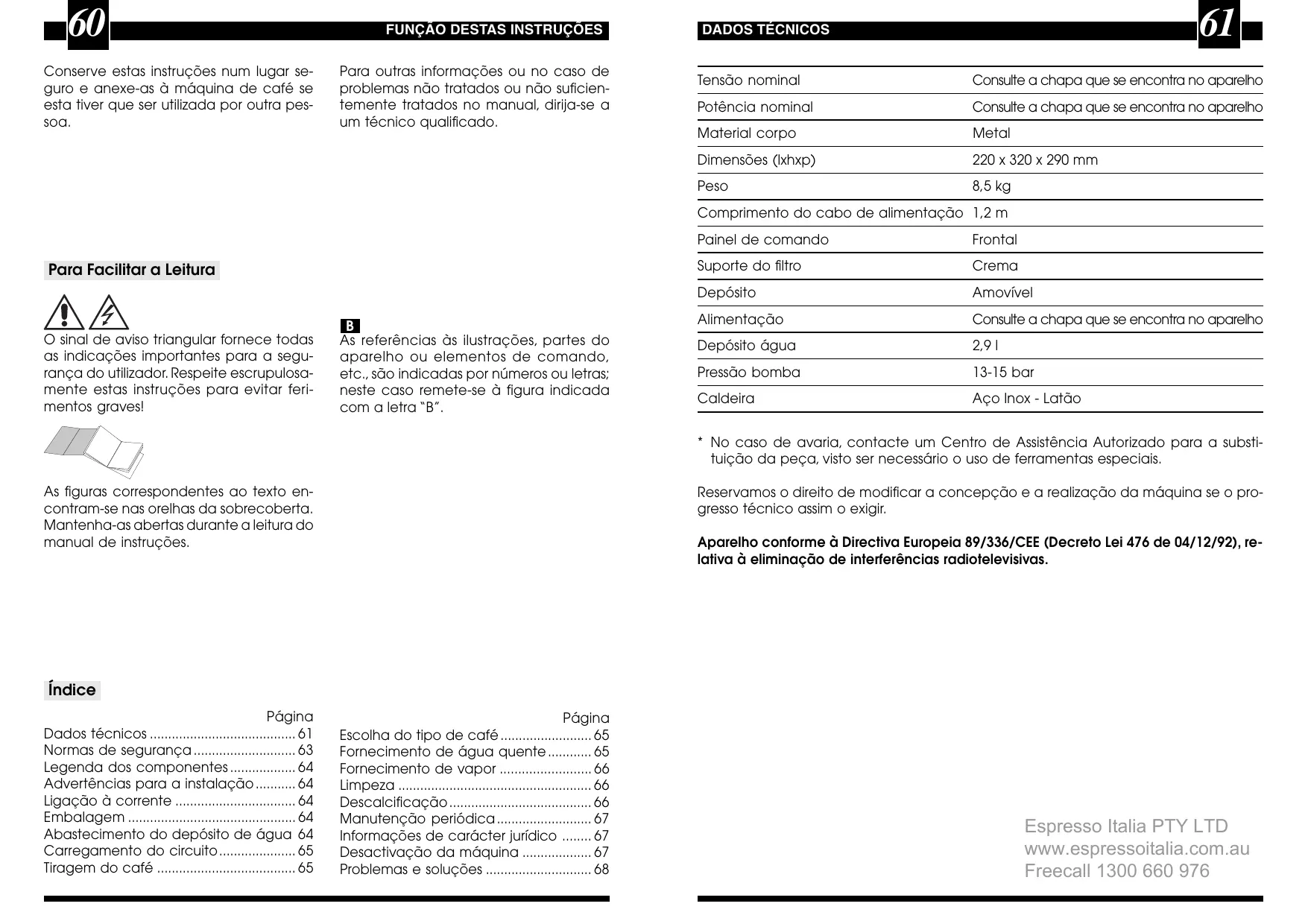 Lorsque l’appareil est inutilisé, déconnecter celui-ci et débrancher la fiche de la prise. Mettre l’appareil en lieu sec et hors de portée des enfants. Réparations/ Entretien En cas de pannes, de défauts ou de défauts redoutés après une chute, débrancher immédiatement l’appareil. Ne jamais mettre en service un appareil défectueux. Ne jamais réparer ou démonter l’appareil personnellement: si les tentatives de réparation ne sont pas effectuées dans toutes les règles de l’art, aucune responsabilité n’est acceptée en cas de dommages. Normes antiincendie Ne jamais utiliser cet appareil en atmosphère Espresso Italia PTY LTD explosible. En cas d’incendie, utiliser des extincteurs à anhydride carbonique (CO2). Ne www.espressoitalia.com.au jamais utiliser d’eau ni d’extincteurs à pouFreecall 1300 660 976 dre.