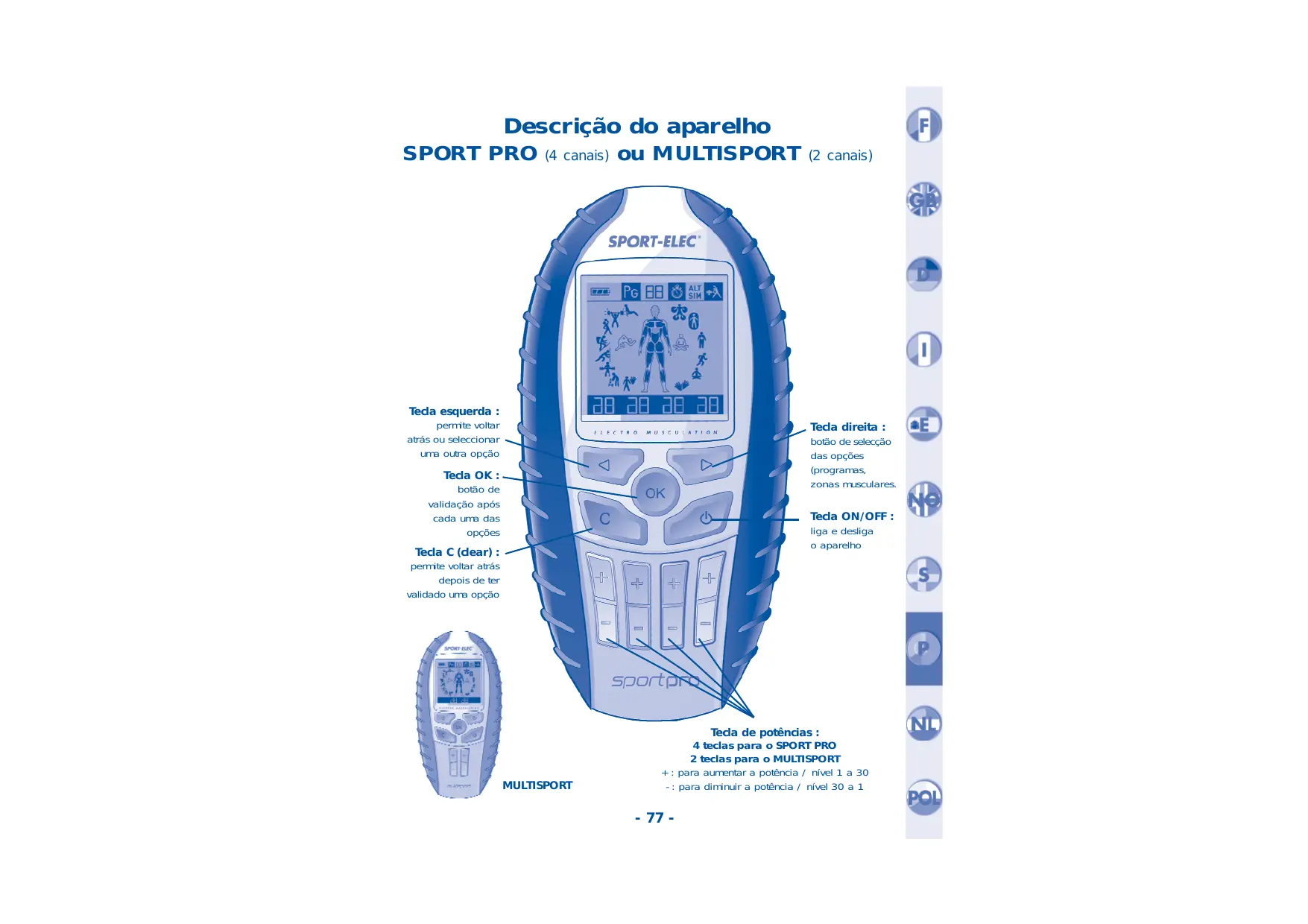 Självhäftande hydrofila och ej allergiframkallande elektroder : 89 x 50 mm (93/42/ EEC) Descrição do aparelho SPORT PRO (4 canais) ou MULTISPORT Tecla esquerda : permite voltar atrás ou seleccionar uma outra opção (2 canais) Tecla direita : botão de selecção das opções (programas, zonas musculares. Tecla OK : botão de validação após cada uma das opções Tecla ON/OFF : liga e desliga o aparelho Tecla C (clear) : permite voltar atrás depois de ter validado uma opção MULTISPORT Tecla de potências : 4 teclas para o SPORT PRO 2 teclas para o MULTISPORT + : para aumentar a potência / nível 1 a 30 - : para diminuir a potência / nível 30 a 1