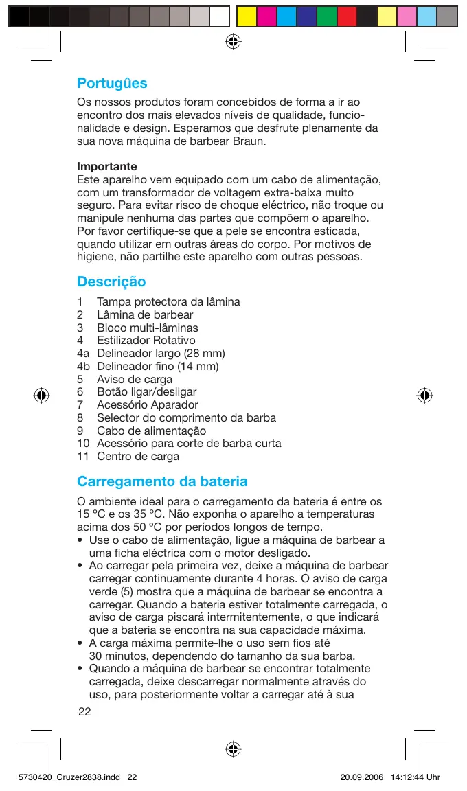 Portugûes Os nossos produtos foram concebidos de forma a ir ao encontro dos mais elevados níveis de qualidade, funcionalidade e design. Esperamos que desfrute plenamente da sua nova máquina de barbear Braun. Importante Este aparelho vem equipado com um cabo de alimentação, com um transformador de voltagem extra-baixa muito seguro. Para evitar risco de choque eléctrico, não troque ou manipule nenhuma das partes que compõem o aparelho. Por favor certifique-se que a pele se encontra esticada, quando utilizar em outras áreas do corpo. Por motivos de higiene, não partilhe este aparelho com outras pessoas. Descrição