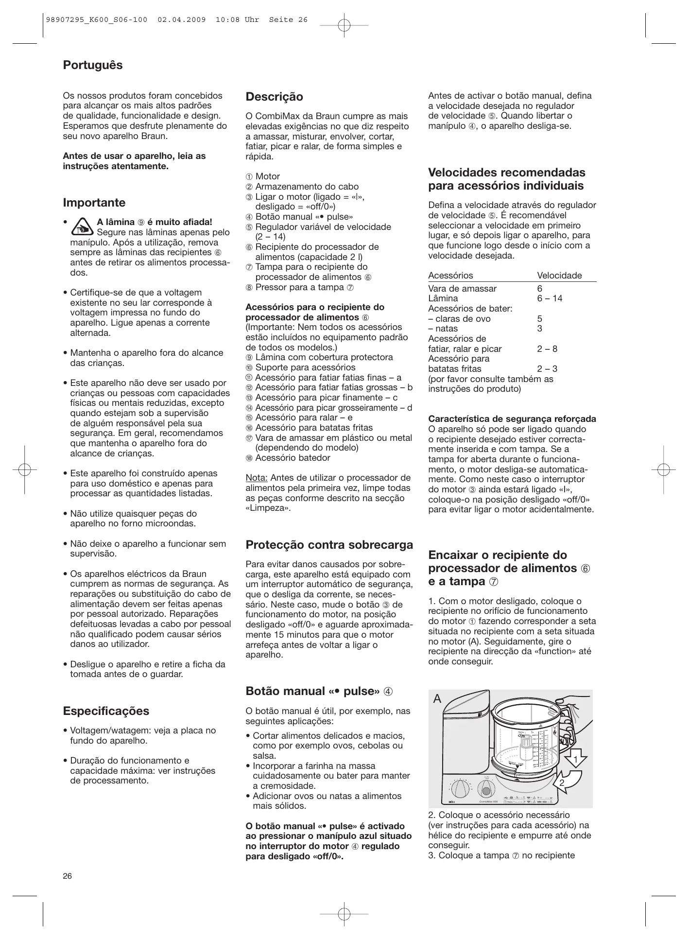 10:08 Uhr Seite 29 Defina a velocidade para 2 – 3 e ligue o aparelho. Antes de voltar a encher, desligue o motor. Utilize o pressor 8 para aplicar uma ligeira pressão ao empurrar as batatas para dentro do tubo. Este aparelho cumpre com a directiva EMC 2004/108/EC e com a Regulamentação de Baixa Voltagem (2006/95/EC). Por favor não deite o produto no lixo doméstico, no final da sua vida útil. Entregue-o num dos Serviços de Assistência Técnica da Braun, ou em locais de recolha específica, à disposição no seu país. Sujeito a alterações sem aviso prévio. Acessórios especiais Espremedor de citrinos Braun PJ 600 Modelo 3200, Velocidade: 2 - 4