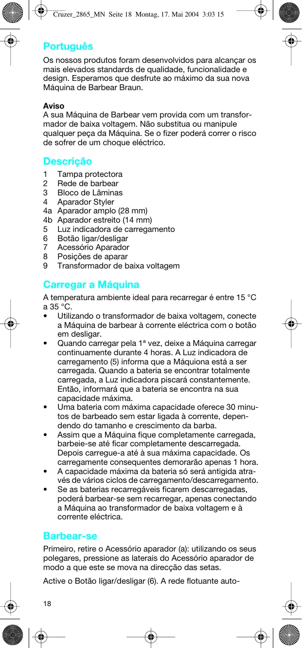 Encontre gratuitamente o manual do aparelho CRUZER3 2878 BRAUN em formato PDF.